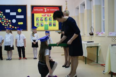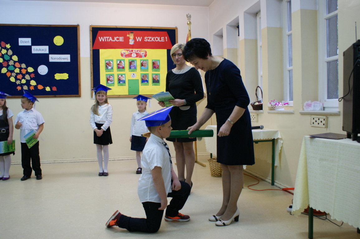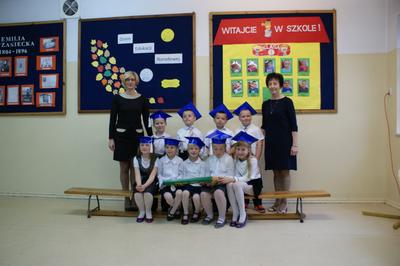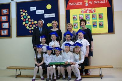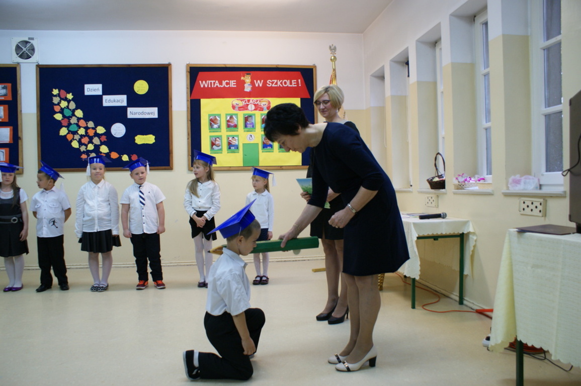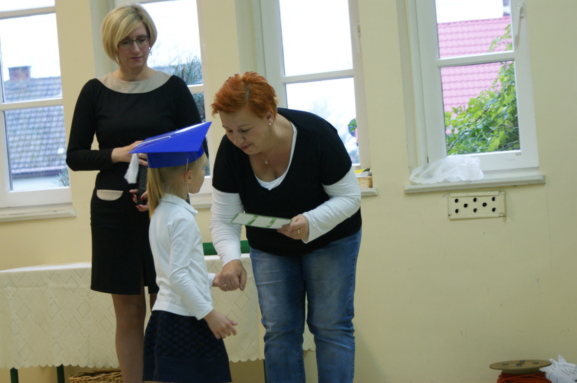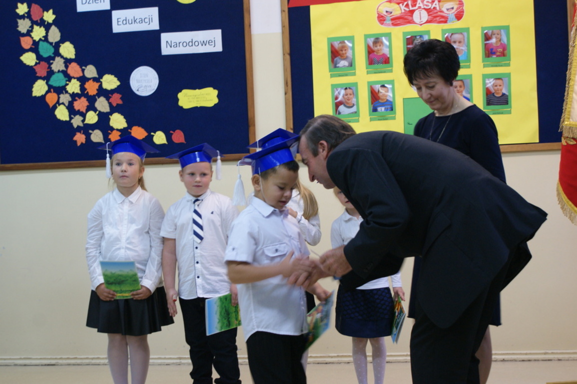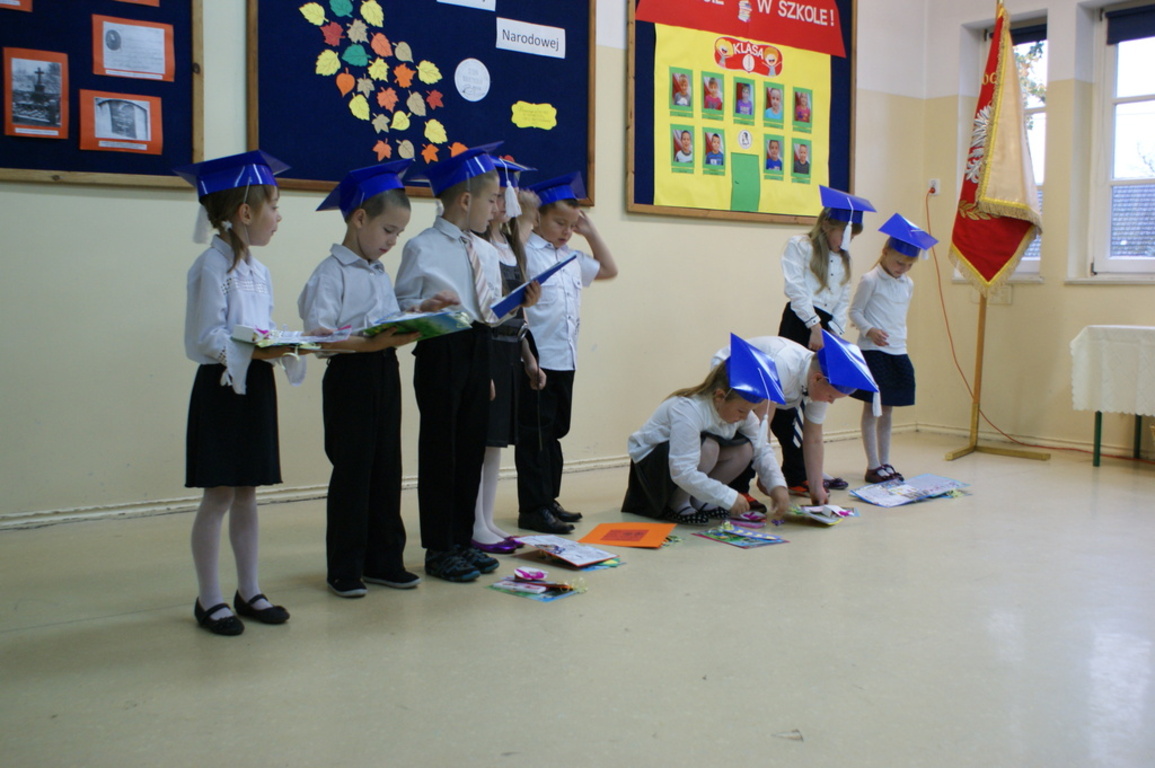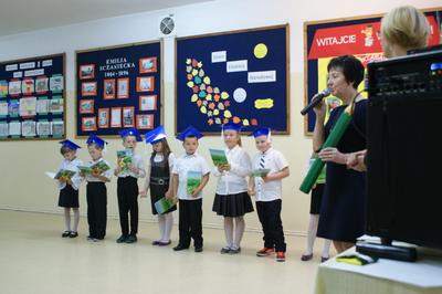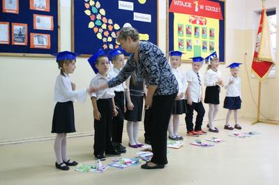 Następnie starsi koledzy wręczyli pierwszoklasistom własnoręcznie wykonane upominki, a zaproszeni goście słodycze. Tradycją naszej szkoły stało się wręczenie uczniom książeczek SKO z wkładem pieniężnym ufundowanym przez Radę Rodziców. Po zakończeniu uroczystości rodzice uczniów kl. I zaprosili gości i nauczycieli na słodki poczęstunek.