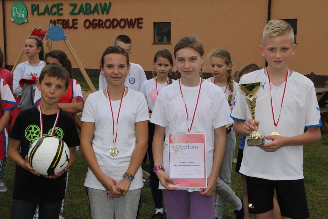 Amelia Kniat, Adrianna Kluge, Kacper Pruszkowski i Alan Pustkowiak reprezentowali naszą szkołę w IV Powiatowym Biegu Patrolowym, który odbył się w Zębowie 01 października br. Zawodnicy musieli wykazać się wiadomościami z zagadnień przyrodniczych, przepisów ruchu drogowego, praktyczną umiejętnością obliczania wieku drzewa oraz umiejętnościami sprawnościowymi - rzut szyszką do celu i przeskokami z skakanką. Nasza drużyna zajęła II miejsce. Gratulujemy!