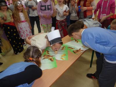 Konkurencja, która co roku budzi duże emocje to jedzenie ciepłych lodów na czas. Uczniowie w grupach po 4 osoby rywalizowali w tej trudnej konkurencji. Śmiechu było co nie miara. Tutaj każdy uczestnik mógł się czuć wygranym. Taniec z balonem to kolejny stały punkt programu. Uczniowie tańczyli parami przytrzymując między sobą balona bez pomocy rąk. Zadanie wydawałoby się proste gdyby nie fakt, że musieli wykonać wiele figur tanecznych, co nieraz przypominało akrobacje cyrkowe.