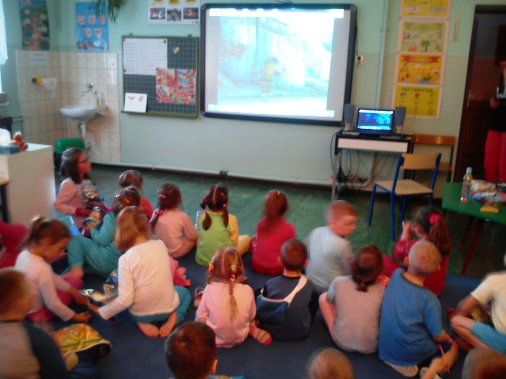 dawniej wyświetlano bajki, pani Bogusia przyniosła projektor do bajek