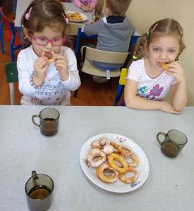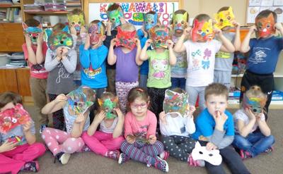 maski,w tłusty czwartek upiekły oponki z pomocą pani Bogusi. Z okazji