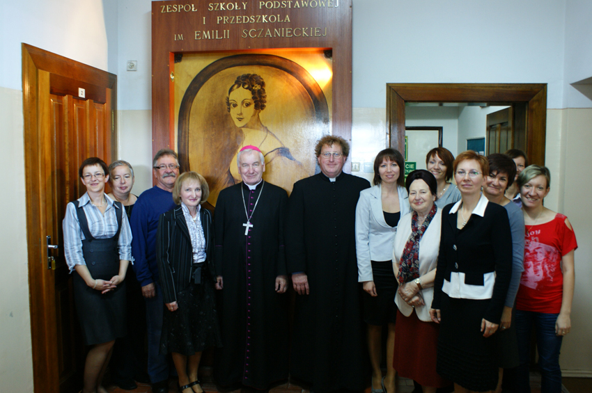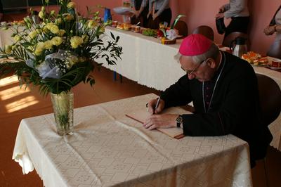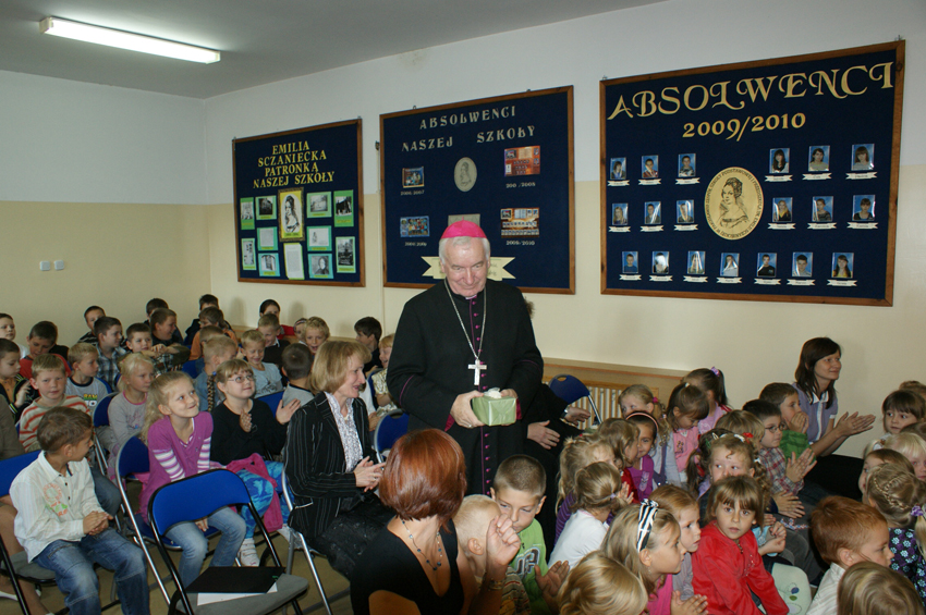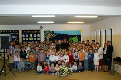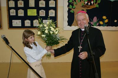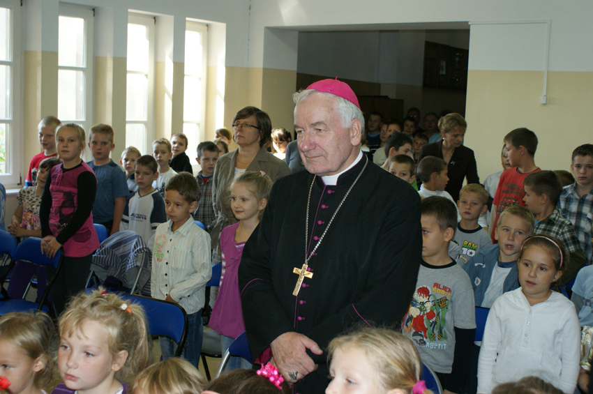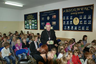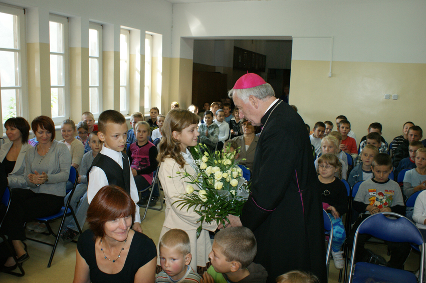 24.IX 2010r gościliśmy w naszej szkole księdza biskupa Zdzisława Fortuniaka oraz księdza proboszcza Staniaława Grośtego. Spotkanie biskupa z uczniami, ich rodzicami oraz pracownikami szkoły przebiegało w miłej i serdecznej atmosferze. Naszym zamiarem było przybliżenie księdzu biskupowi fragmentu naszej codziennej pracy oraz historii związanej z naszą szkołą, toteż zaprezentowaliśmy pokaz multimedialny poświęcony właśnie tym zagadnieniom. Ksiądz biskup, w swojej mowie do uczniów, zwrócił uwagę na duże zaangażowanie dzieci w działalność szkoły.Kończąc odwiedziny, biskup udzielił wszystkim błogosławieństwa i życzył sukcesów w nowym roku szkolnym.