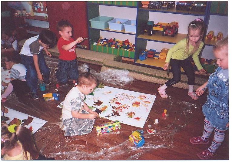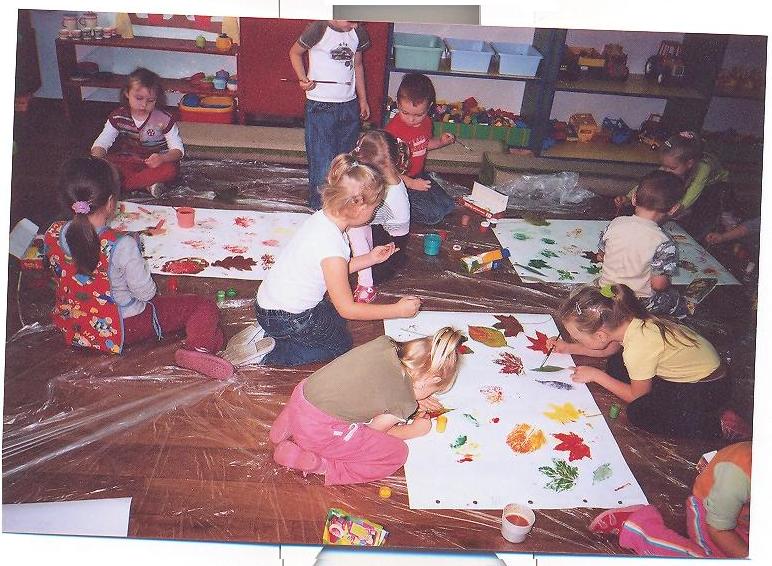 Przy muzyce, słowie literackim i obrazie dzieci ujawniały swoją wrażliwość na piękno otaczającej je rzeczywistości. Jedną z form pracy była aktywność plastyczna, mająca na celu tworzenie kompozycji jesiennej techniką kolażu, w grupie młodszej z wykorzystaniem liści i darów jesieni zebranych podczas spacerów. Natomiast dzieci sześcioletnie tworzyły tą samą metodą bukiety jesienne. Był to jeden z wielu dni aktywności twórczej naszych dzieci, podczas których kredki, farby i inne przedmioty są przyjaciółmi dzieci w ich twórczym działaniu.