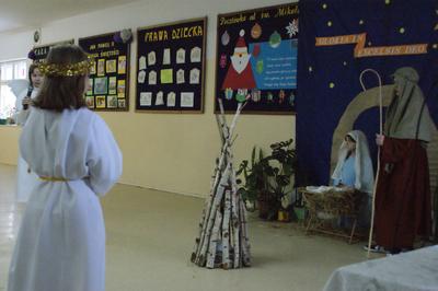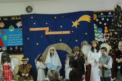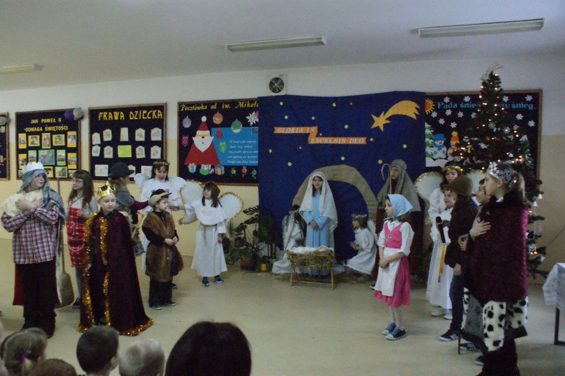 Świąteczny dzień w naszej szkole rozpoczął się przedstawieniem przez dzieci Jasełek przygotowanych pod kierunkiem pani Urszuli Matuszewskiej. Uroczysty charakter tego spotkania podkreśliło wspólne śpiewanie kolęd. Następnie dzieci przeszły do klas, gdzie wspólnie z wychowawcami złożyły sobie życzenia świąteczne i noworoczne oraz podzieliły się opłatkiem.Pod choinką na każdego czekały słodkie prezenty. Przy tej okazji każdy złożył noworoczne przyrzeczenie, obiecując poprawę swojego zachowania.