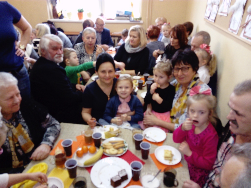 24.01.2017 w przedszkolu zjawili się dostojni goście Dziadkowie na spotkaniu z okazji ich święta. Spotkanie składało się jakby z trzech części. Najpierw była część artystyczna na holu poświęcona wszystkim babciom i dziadkom w podziękowaniu za ich miłość i czas poświęcony wnukom. Następnie starszacy przedstawili bajkę pt ”Czerwony Kapturek”. Dzieci doskonale wcieliły się w swoje role i mimo drobnych niedociągnięć, były ogromne brawa i uśmiechy od dziadków. Po programie artystycznym wszyscy udali się do sal przedszkolnych na wspólny poczęstunek. Dziękujemy wszystkim dziadkom za przybycie a rodzicom za pomoc w organizacji spotkania.