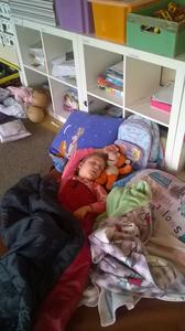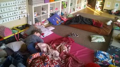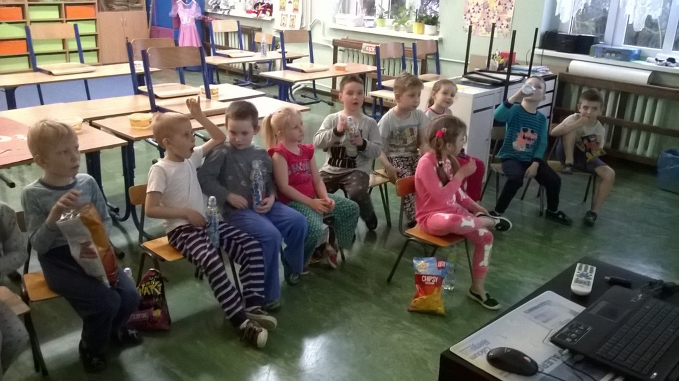 Po dobrym jedzeniu było kino, później czytanie bajek i .....spanie. Kto nie mógł zasnąć to miał "nocne pogaduchy" z paniami i oczka same się zamykały. O szóstej rano była pierwsza pobudka i rozmowy. Po porannej toalecie i śniadaniu był czas na wspólną zabawę. Czas minął nam szybko i miło.