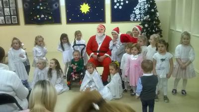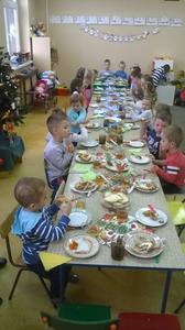 Czas przedświąteczny to najlepsze dni w roku.W środę 20.12.2017 w przedszkolu była wigilia.Dzieci podzieliły się opłatkiem i złożyły sobie życzenia, następnie usiedli do świątecznie przygotowanych stolików. Pani Dorotka przygotowała tradycyjne wigilijne potrawy: barszczyk, klopsiki z ryb, kapusta z grzybkami, pierogi no i oczywiście pierniki i owoce. Wiadomo, że po wigilii czeka się na prezenty, Przedszkolaki musieli czekać aż do czwartku na Gwiazdora.Wtedy bowiem do nich przyszli rodzice na spotkanie przy choince i odwiedził ich Gwiazdor.Najpierw był program artystyczny w wykonaniu wszystkich dzieci, niektórym pojawiła się łezka w oku, inni stracili głos gdy tylko zobaczyli długo oczekiwanego gościa.Ale wszystko udało się wspaniale,każdy otrzymał prezent.Po spotkaniu na hollu był poczęstunek w salach przedszkolnych.Nie zabrakło pysznego ciasta, pierników i ciasteczek.