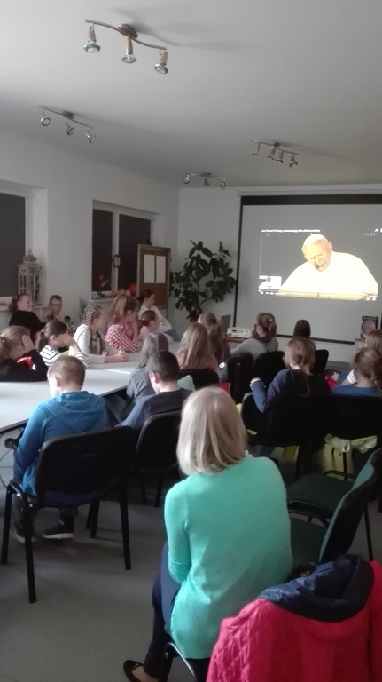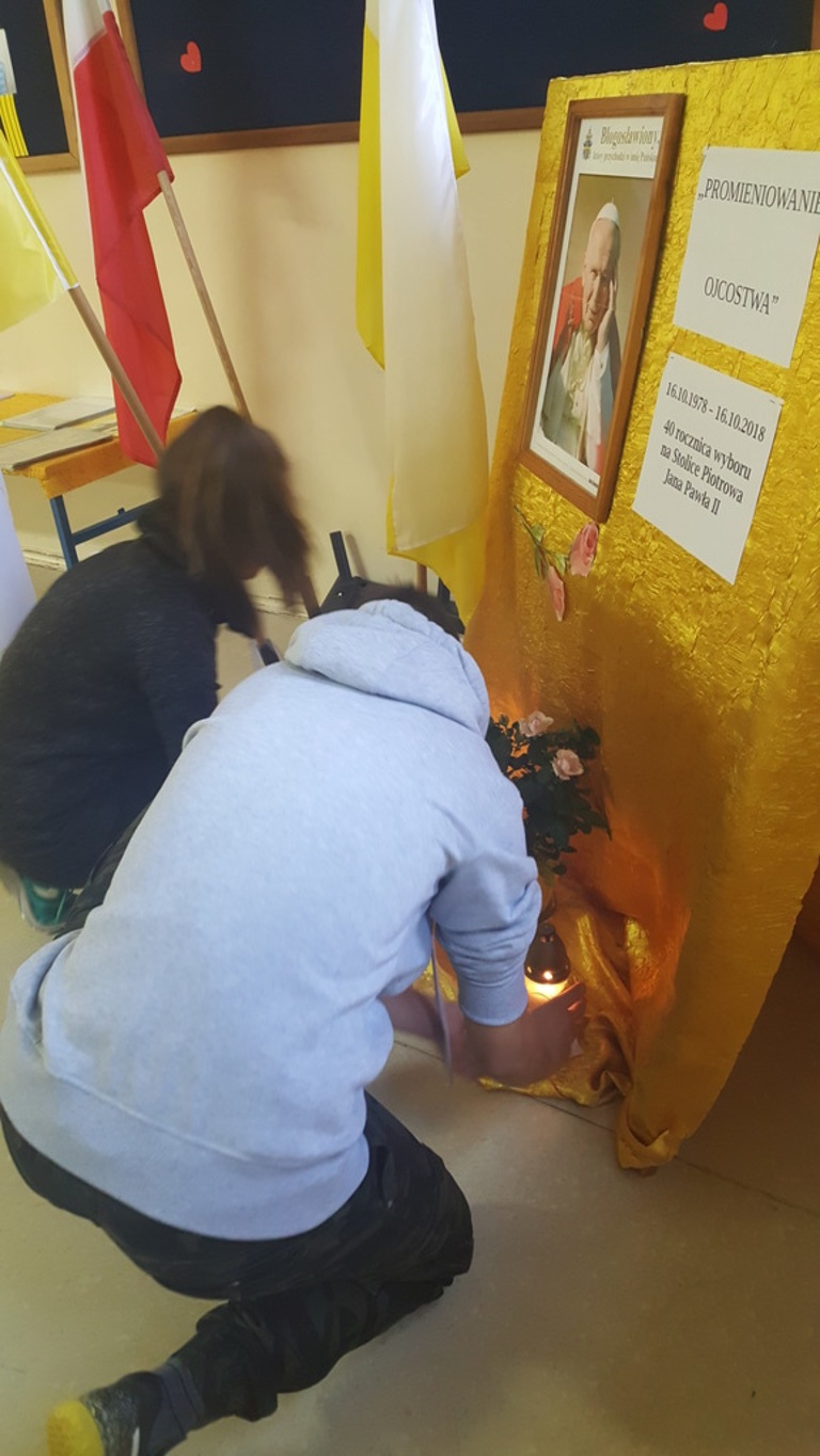 W dniu 16.10.2018 r.społeczność szkolna i przedszkolacy uczcili pamięć Jana Pawła II z okazji 40 rocznicy wyboru na Stolicę Piotrową. Dzień rozpoczął się krótkim apelem, uczniowie zaśpiewali ulubioną pieśń Papieża pt."Barka" oraz zapalili znicze pod wizerunkiem Jana Pawła. Uczniowie kl I-IV oglądali film animowany pt."Jan Paweł II"i wykonywali gołąbki pokoju z Ojcem św. Uczniowie kl.VIII obejrzeli film pt"Jan Paweł II, człowiek, który zmienił świat". Natomiast uczniowie kl V-VII uczestniczyli w warsztatach zorganizowanych przez Bibliotekę Publiczną we Lwówku poświęconych papieżowi. Oglądali film pt."Jan Paweł II święty, uśmiechnięty" i rozwiązywali quiz. Natomiast przedszkolacy odwiedzili kącik na holu poświęcony Ojcu Św., obejrzeli krótki film animowany "Jan Paweł II" i wykonali ozdobne ramki ze zdjęciem papieża.