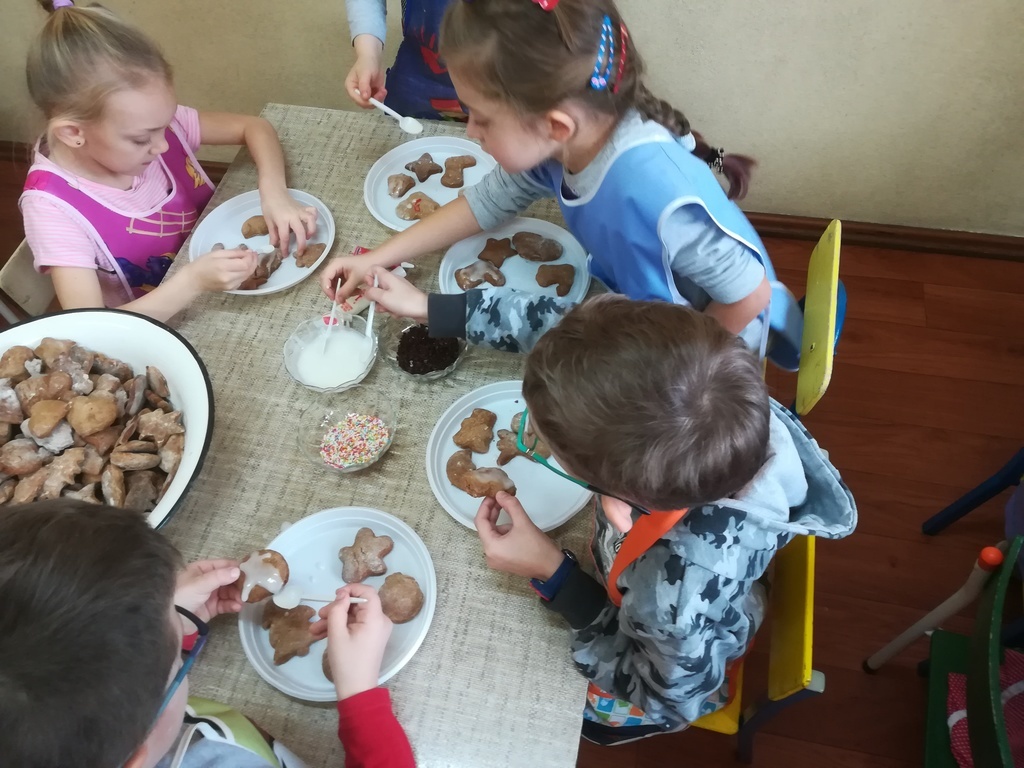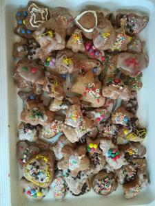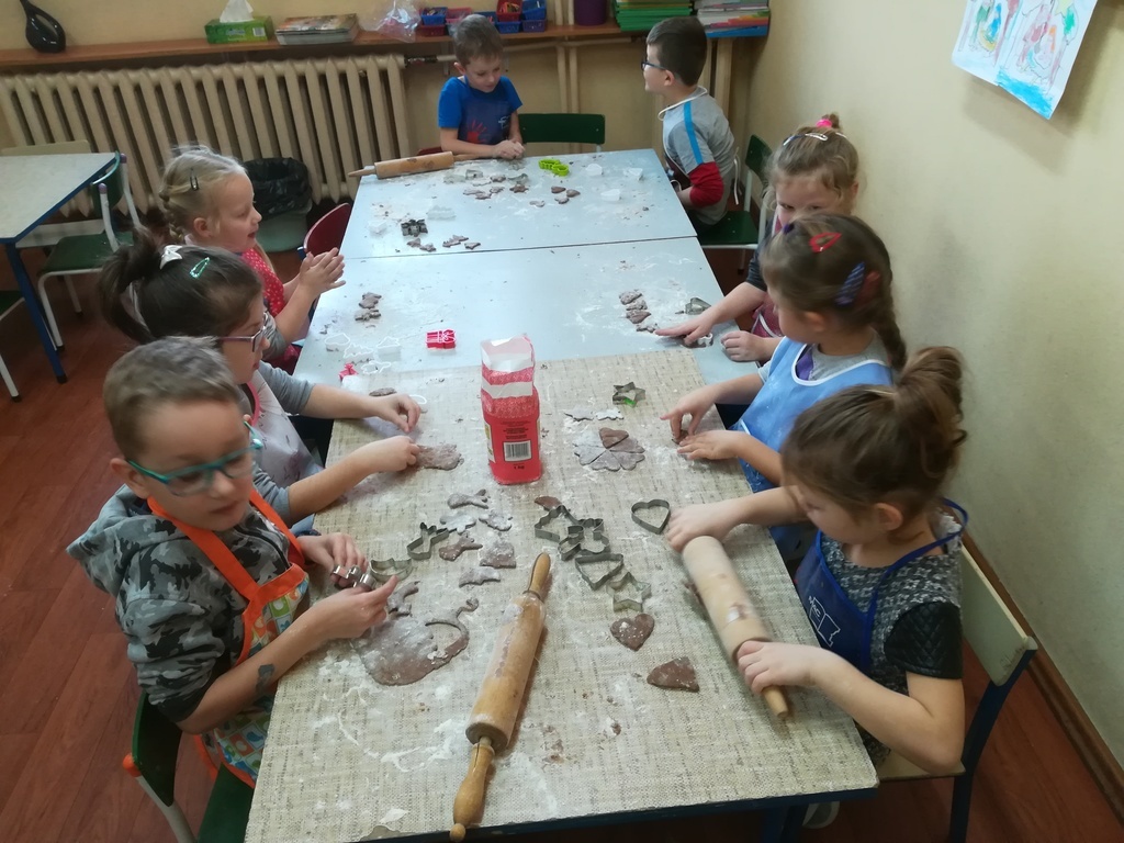 W środę 12.12.2018 r. po szkole roznosił się zapach pierników przypominający o zbliżających się świętach.To przedszkolacy, przygotowując się do nich, piekły pierniki. Najpierw pani Bogusia przygotowała produkty i ciasto. Następnego dnia dzieci zabrały się do pracy, ugniatały ciasto, wycinały pierniki a po upieczeniu najprzyjemniejszy moment, dekorowanie i smakowanie pięknych i pysznych pierników. Wszystkim bardzo smakowały, mamy nadzieję, że rodzicom, którzy przyjdą na spotkanie przy choince też będą smakować.