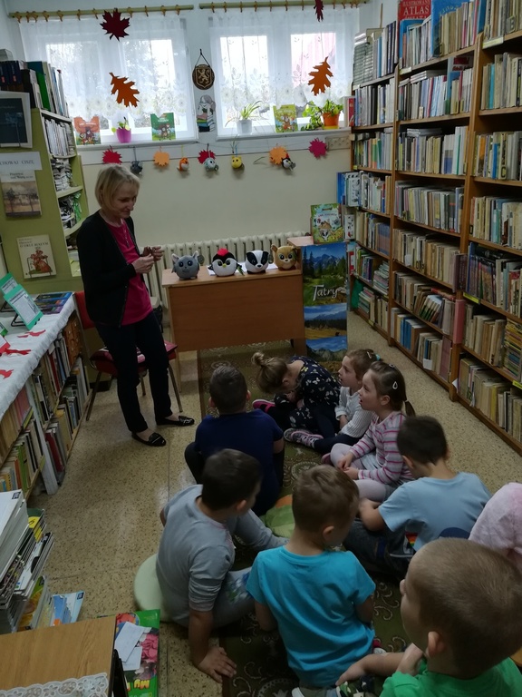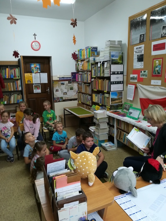 We Wtorek 12.11. starszacy byli w bibliotece, aby poznać kolejne przygody bohaterów z cyklu "Gang Słodziaków".Tym razem pani Ulka przeczytała rozdział pt. "Domek na plecach". Wszyscy z wielkim zainteresowaniem słuchali historii ślimaka i jego przyjaciela, którzy wybierali się nad wodę.Oczywiście nie mogło zabraknąć naklejek do naszych książeczek.