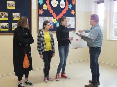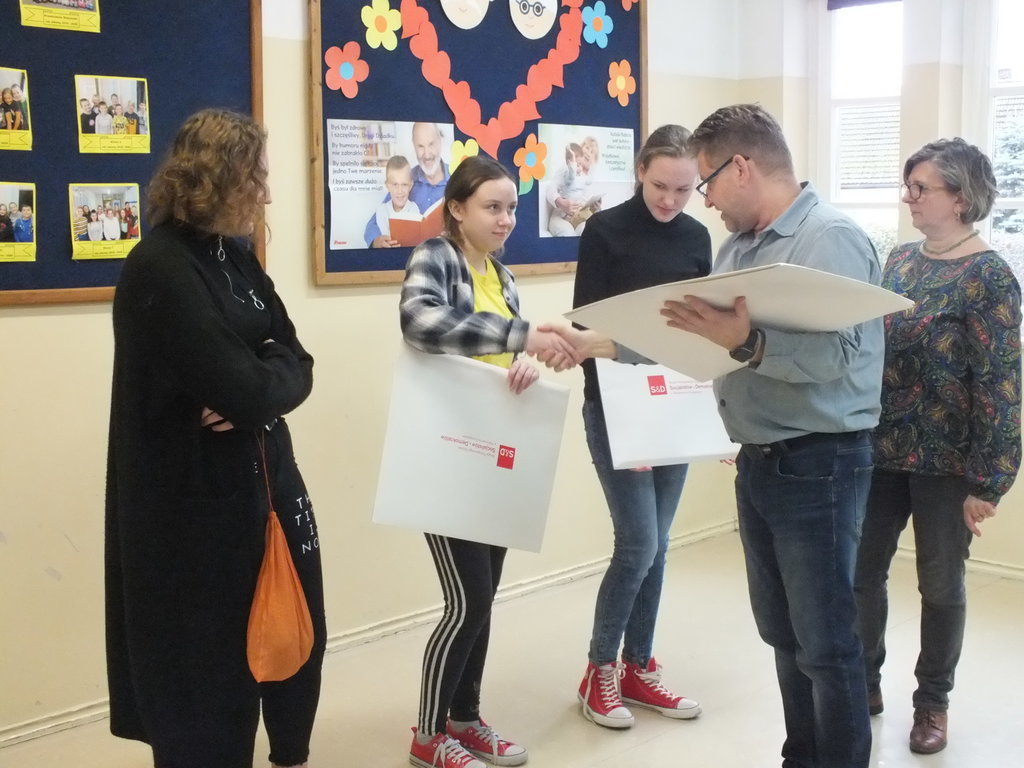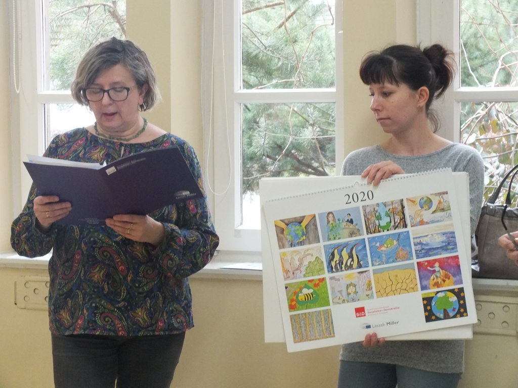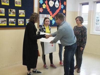 11.02 2020r w czasie spotkania na holu wręczono uczniom biorącym udział w konkursie plastycznym ,,Sojusz z Ziemią’ ,organizowanym przez Biuro Posła do Parlamentu Europejskiego Leszka Millera, pamiątkowe kalendarze ilustrowane pracami dzieci. Temat pracy konkursowej brzmiał: Pod wpływem problemów klimatycznych świat zmienia się na naszych oczach, a ich kierunek często budzi obawy. Przy pomocy środków plastycznych, pokaż nam triumf natury nad postępującymi zmianami klimatu. W naszej szkole upominki te otrzymali: Paulina Białas kl. 7, Agnieszka Szymańska kl.8 i Marlena Dzikowska kl.8