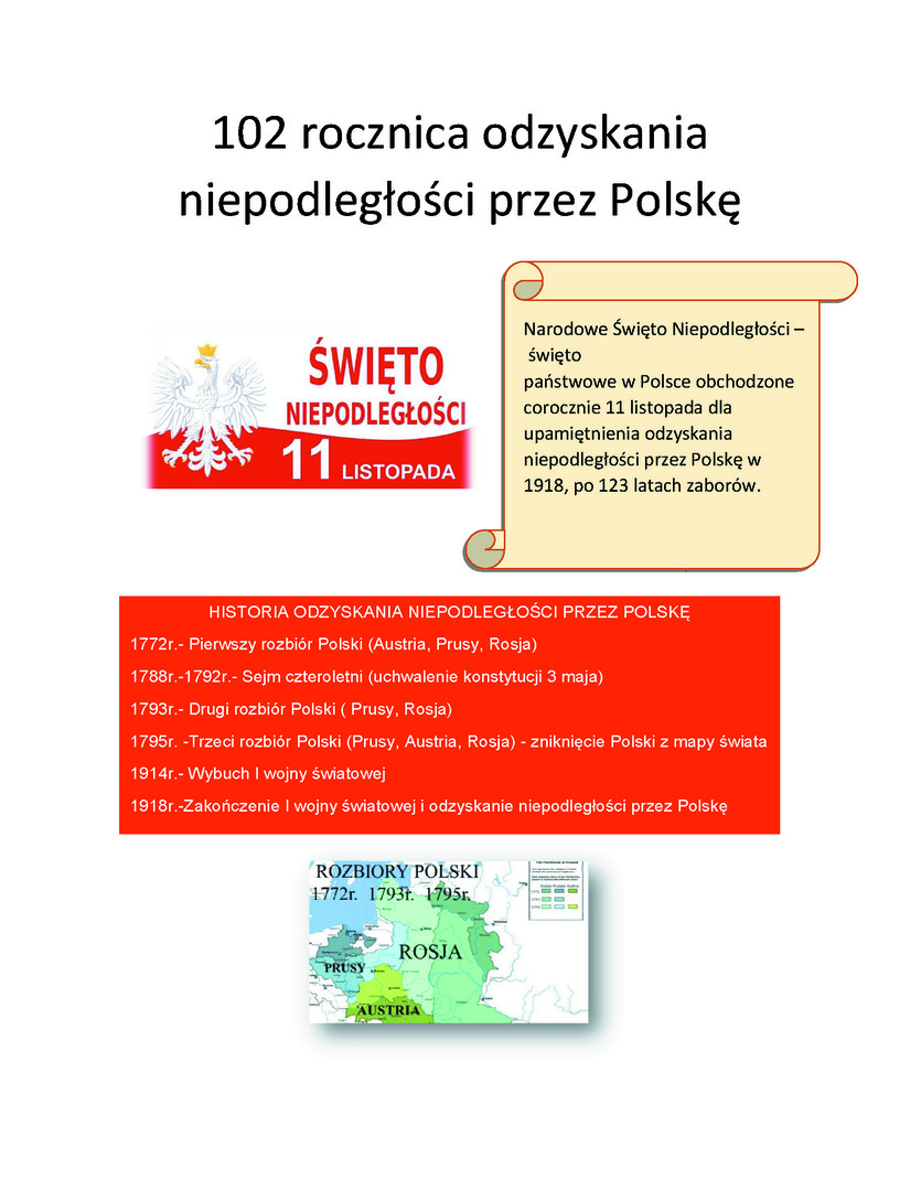 11 listopada 2020 roku przypada 102. rocznica odzyskania przez Polskę niepodległości. Tego dnia w całym kraju uroczyście obchodzi się Narodowe Święto Niepodległości.