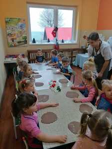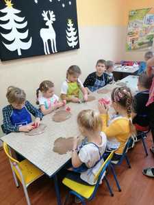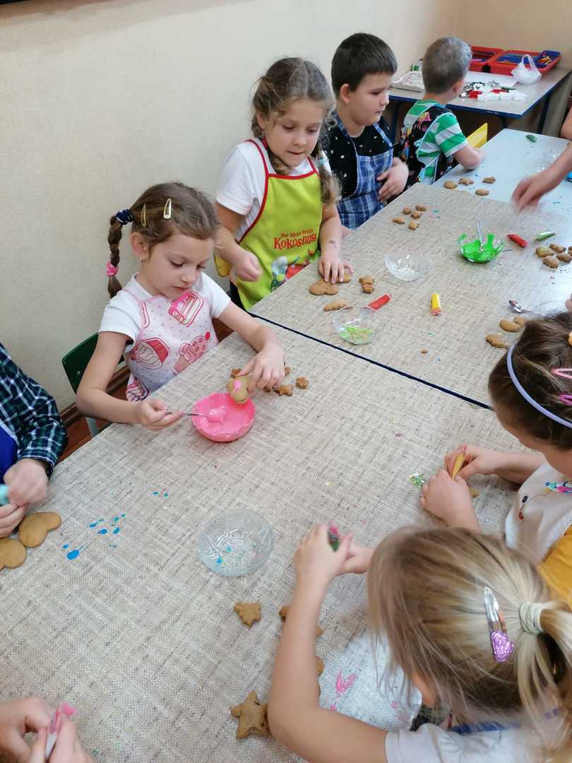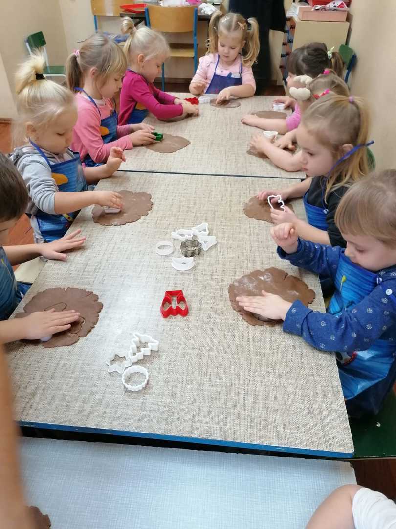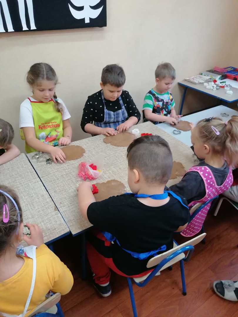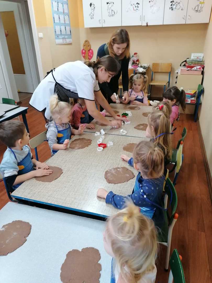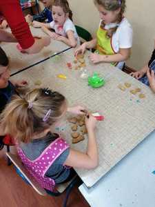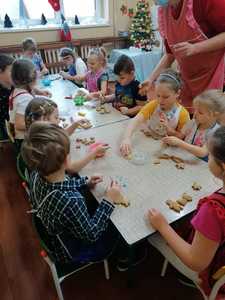 W środę 9.12.2020 po szkole roznosił się zapach piernikowego ciasta. To przedszkolacy rozpoczęli przygotowywanie się do świąt od pieczenia pierników. Najpierw przypatrywali się jak pani Patrycja przygotowuje ciasto, odczytywali nazwy produktów i odmierzali potrzebną ich ilość. Na drugi dzień gdy ciasto dojrzało ochoczo przystąpili do wycinania ciasta i dekorowania upieczonych pierników. Z powodu pandemii nie będzie spotkania z rodzicami przy choince, dlatego przygotowane pierniczki dzieci zabrały do domu aby poczęstować domowników. To był miły i radosny dzień w przedszkolu