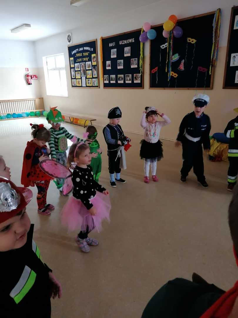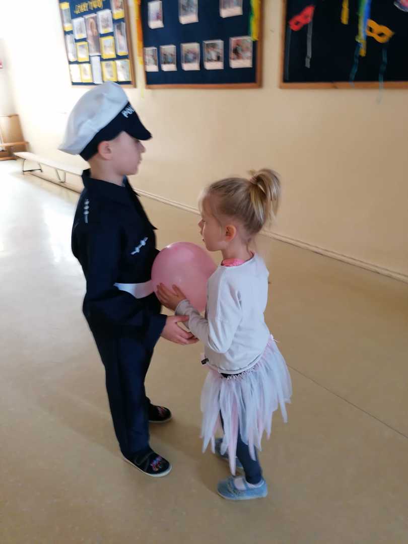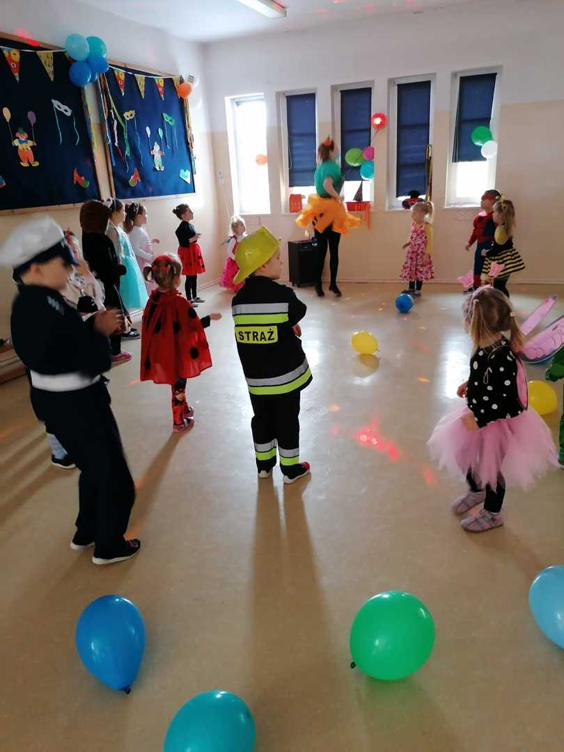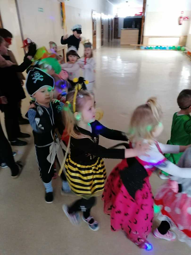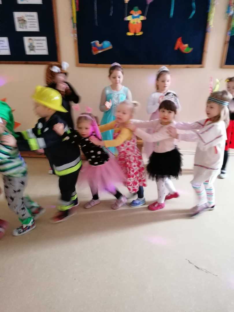 Karnawał to czas balów i zabaw, dlatego w środę 10.02.2021 r. w przedszkolu odbył się bal przebierańców. Wcześniej dzieci rozmawiały i przygotowywały się do balu. We wtorek starszacy dzielnie dmuchali balony, dzieci młodsze robiły maski i wszyscy razem poszli stroić hol do wspólnej zabawy. W środę wszystkie dzieci uśmiechnięte w pięknych strojach pojawiły się w przedszkolu, niektórych trudno było rozpoznać.Po śniadanku wszyscy udali się na hol. Pan Dyrektor przywitał dzieci i życzył udanej zabawy.Najpierw obie grupy zaprezentowały swoje stroje, później już tylko zabawa, tańce i konkursy.Był też koncert pt:"Czy możemy już tańczyć?" podczas którego uczyły się kroków tańca Balboa.Aby dzieciom nie zabrakło sił panie Patrycja i Pamela upiekły pączki a Rada Rodziców zakupiła wafelki.To był miły dzien w przedszkolu.