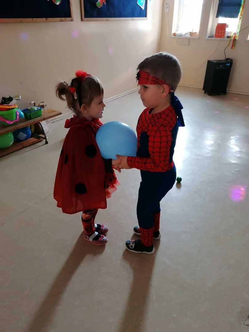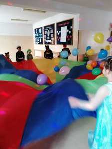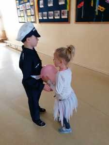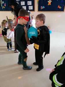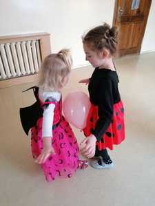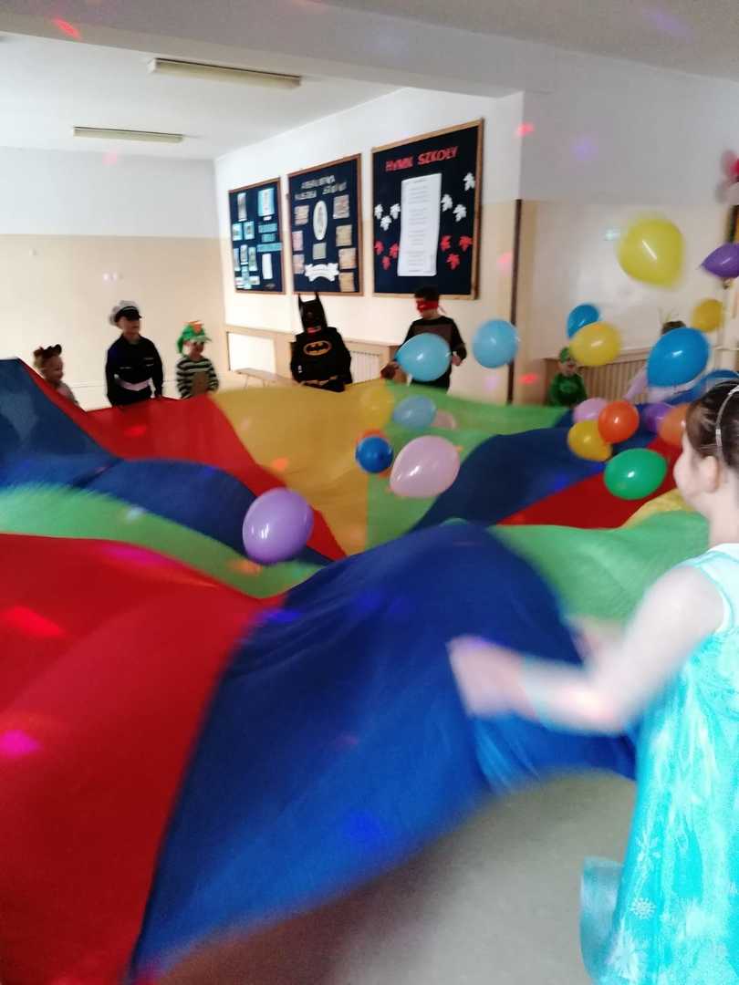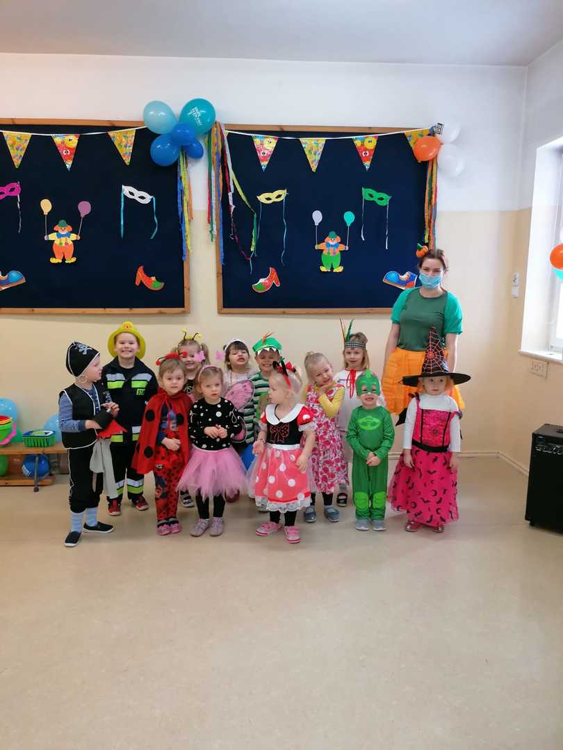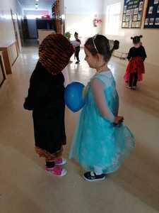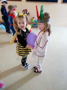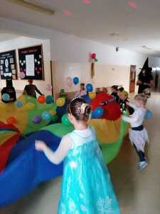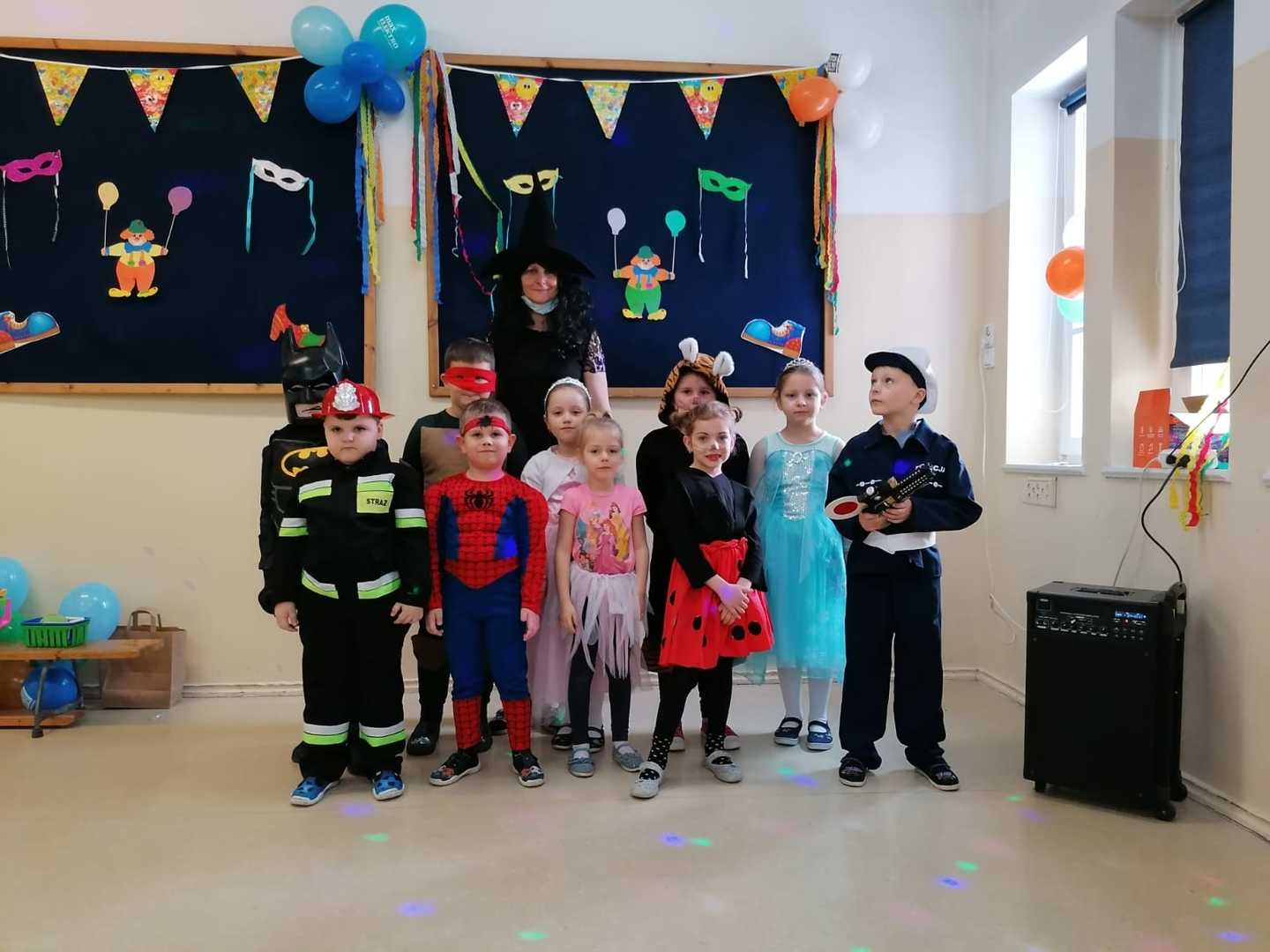 Karnawał to czas balów i zabaw, dlatego w środę 10.02.2021 r. w przedszkolu odbył się bal przebierańców. Wcześniej dzieci rozmawiały i przygotowywały się do balu. We wtorek starszacy dzielnie dmuchali balony, dzieci młodsze robiły maski i wszyscy razem poszli stroić hol do wspólnej zabawy. W środę wszystkie dzieci uśmiechnięte w pięknych strojach pojawiły się w przedszkolu, niektórych trudno było rozpoznać.Po śniadanku wszyscy udali się na hol. Pan Dyrektor przywitał dzieci i życzył udanej zabawy.Najpierw obie grupy zaprezentowały swoje stroje, później już tylko zabawa, tańce i konkursy.Był też koncert pt:"Czy możemy już tańczyć?" podczas którego uczyły się kroków tańca Balboa.Aby dzieciom nie zabrakło sił panie Patrycja i Pamela upiekły pączki a Rada Rodziców zakupiła wafelki.To był miły dzien w przedszkolu.