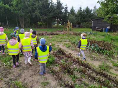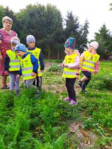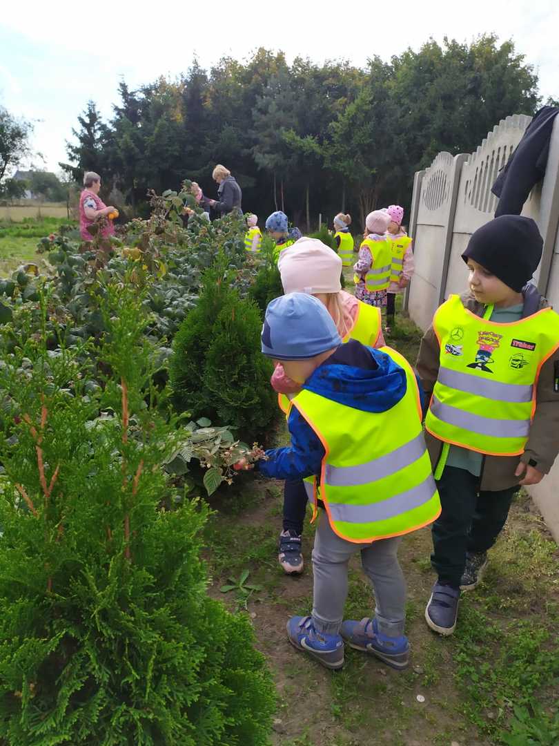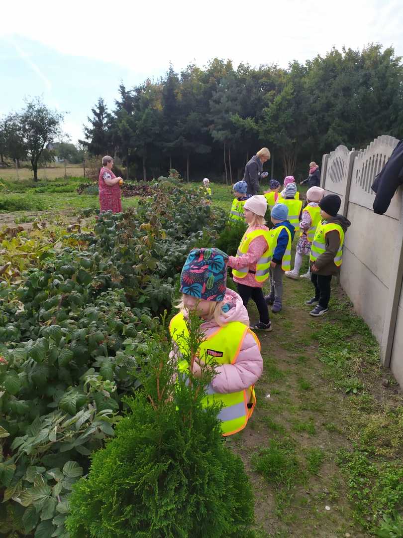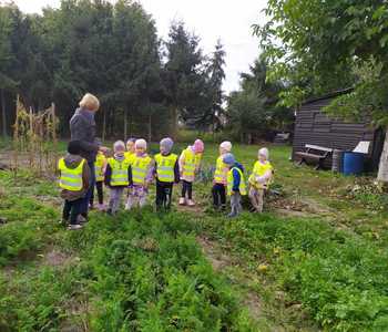 Podczas poznawania warzyw i owoców przedszkolacy udali się na wycieczkę do ogródka pani Ewy. Dzieci rozpoznawały i nazywały warzywa, obserwowały drzewa i krzewy owocowe. Pani Ewa opowiedziała o pracy w ogrodzie jesienią, pokazała jak rosną warzywa i owoce. Na koniec spotkania poczęstowała malinami i podarowała warzywa na zajęcia, aby utrwalić zdobytą wiedzę. Dziękujemy pani Ewie za miłe przyjęcie.