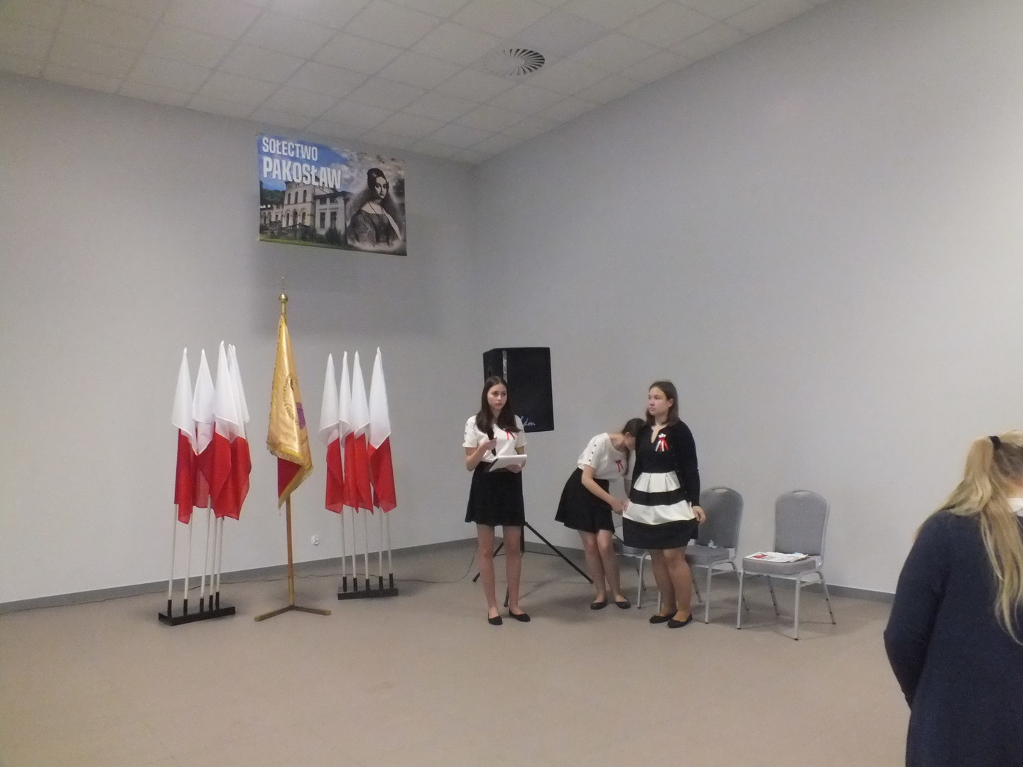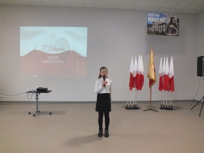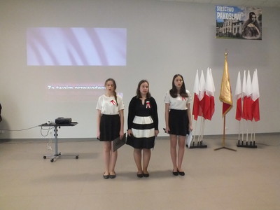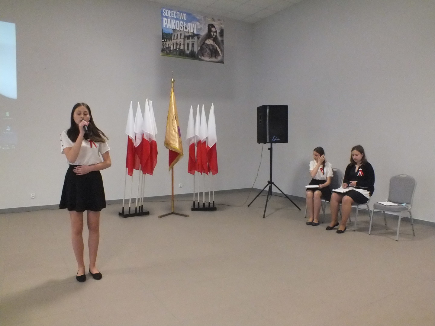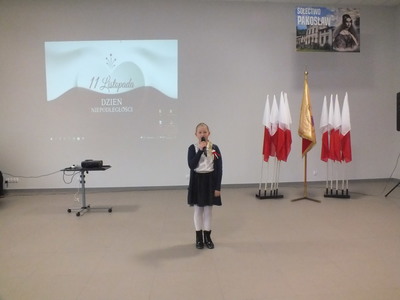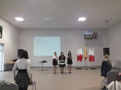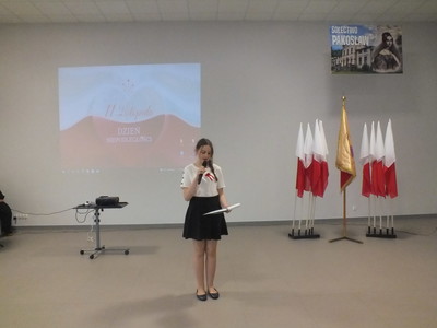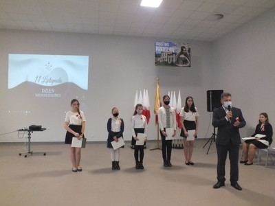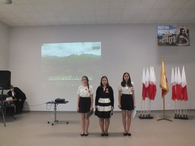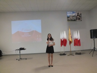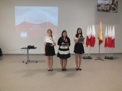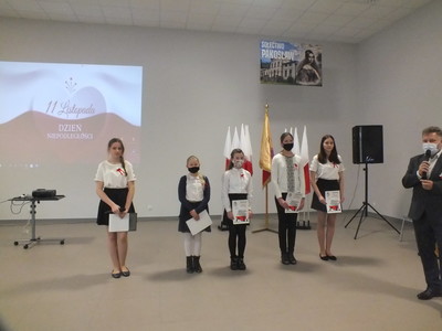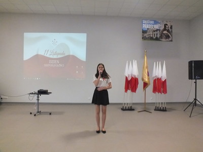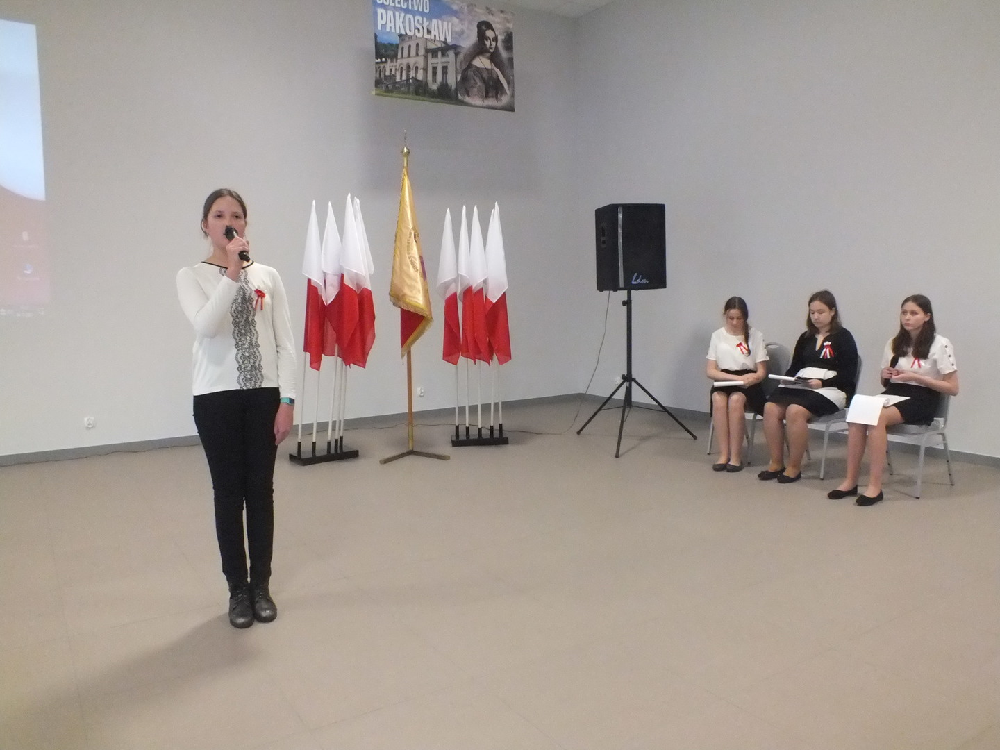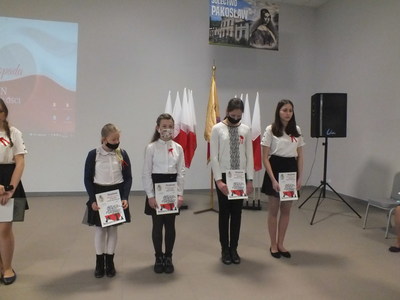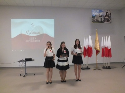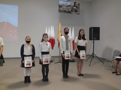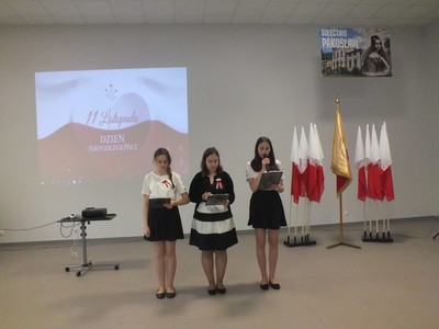 Amelia Kaczmarek, Nikola Robak, Marcelina Szarata i Oliwia Czapracka - uczennice klas 4-8 - swój patriotyzm wyraziły prezentacją wierszy. Były to utwory wyłonione w szkolnym Konkursie Recytatorskim
