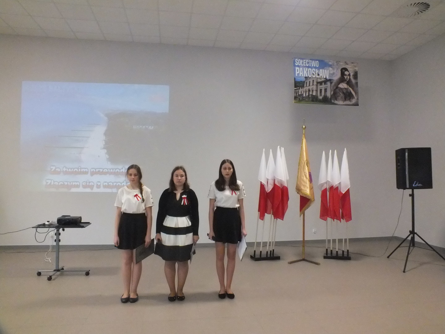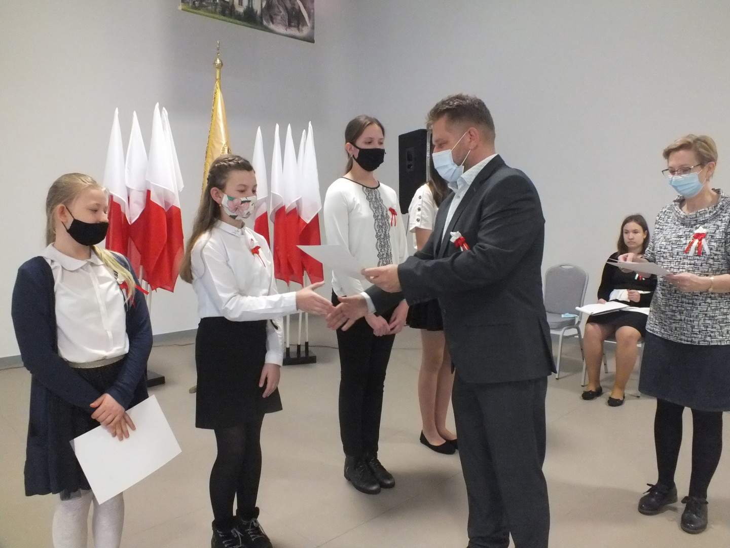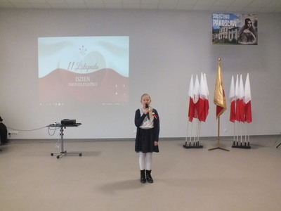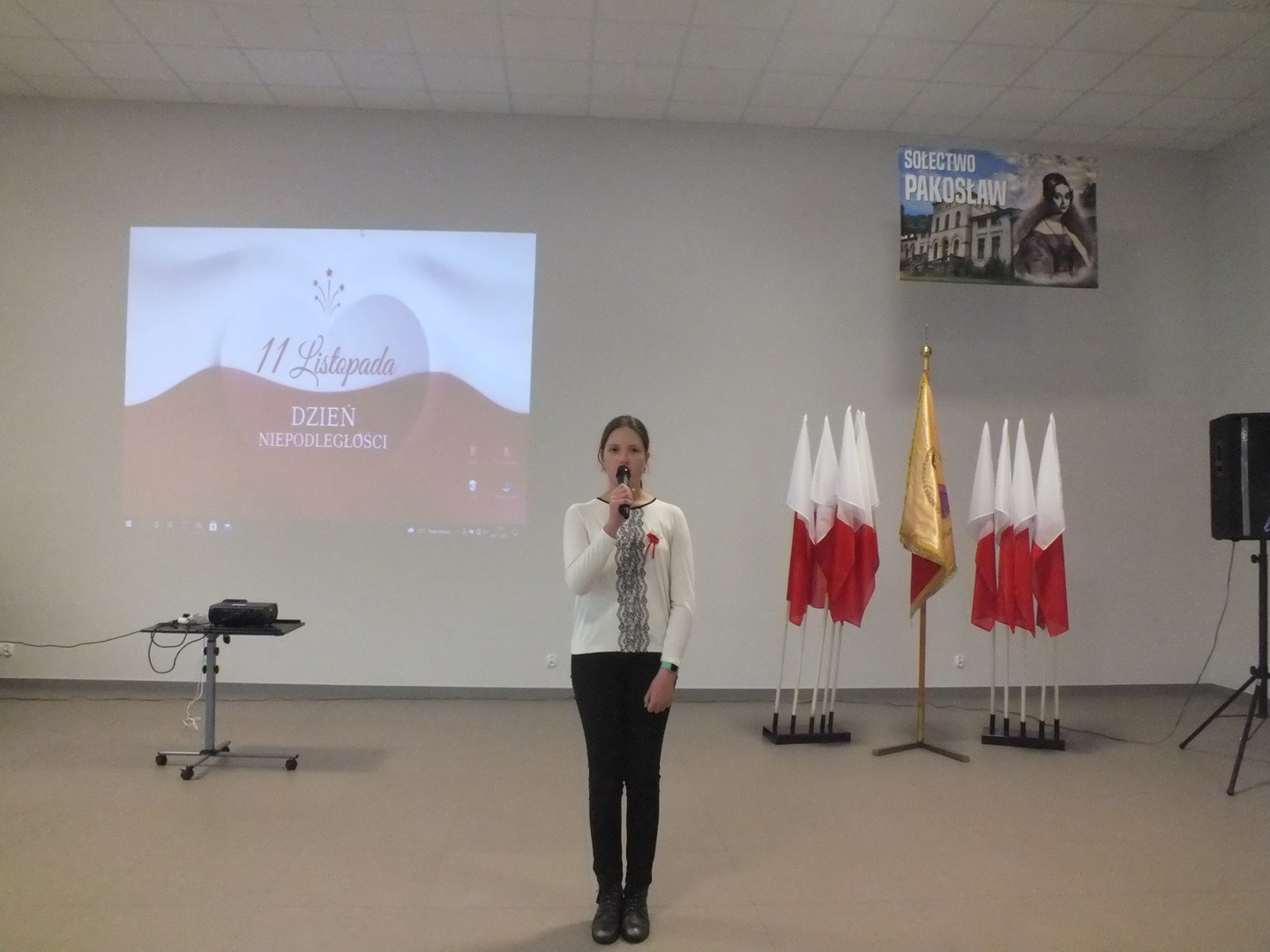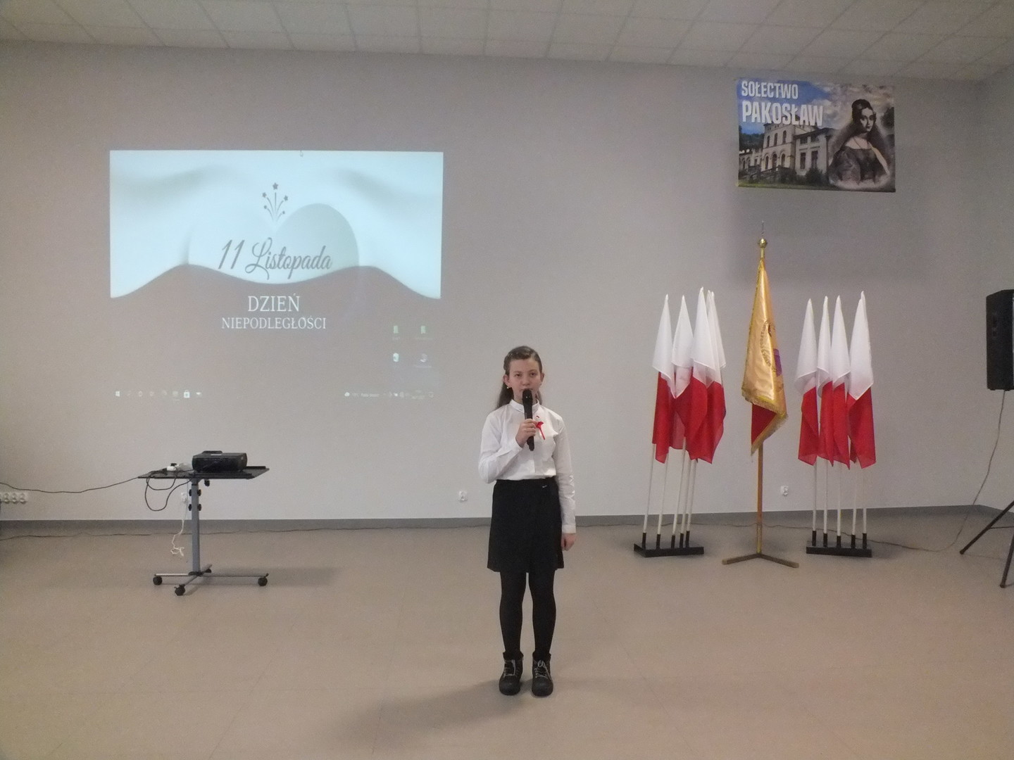 Amelia Kaczmarek, Nikola Robak, Marcelina Szarata i Oliwia Czapracka - uczennice klas 4-8 - swój patriotyzm wyraziły prezentacją wierszy. Były to utwory wyłonione w szkolnym Konkursie Recytatorskim