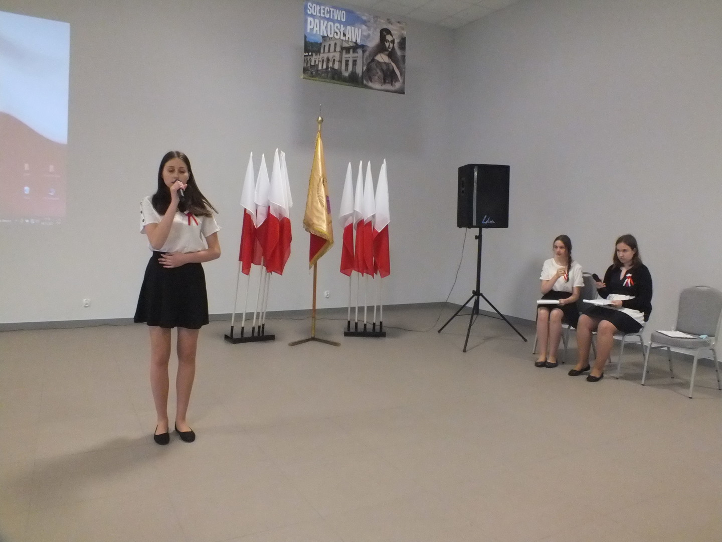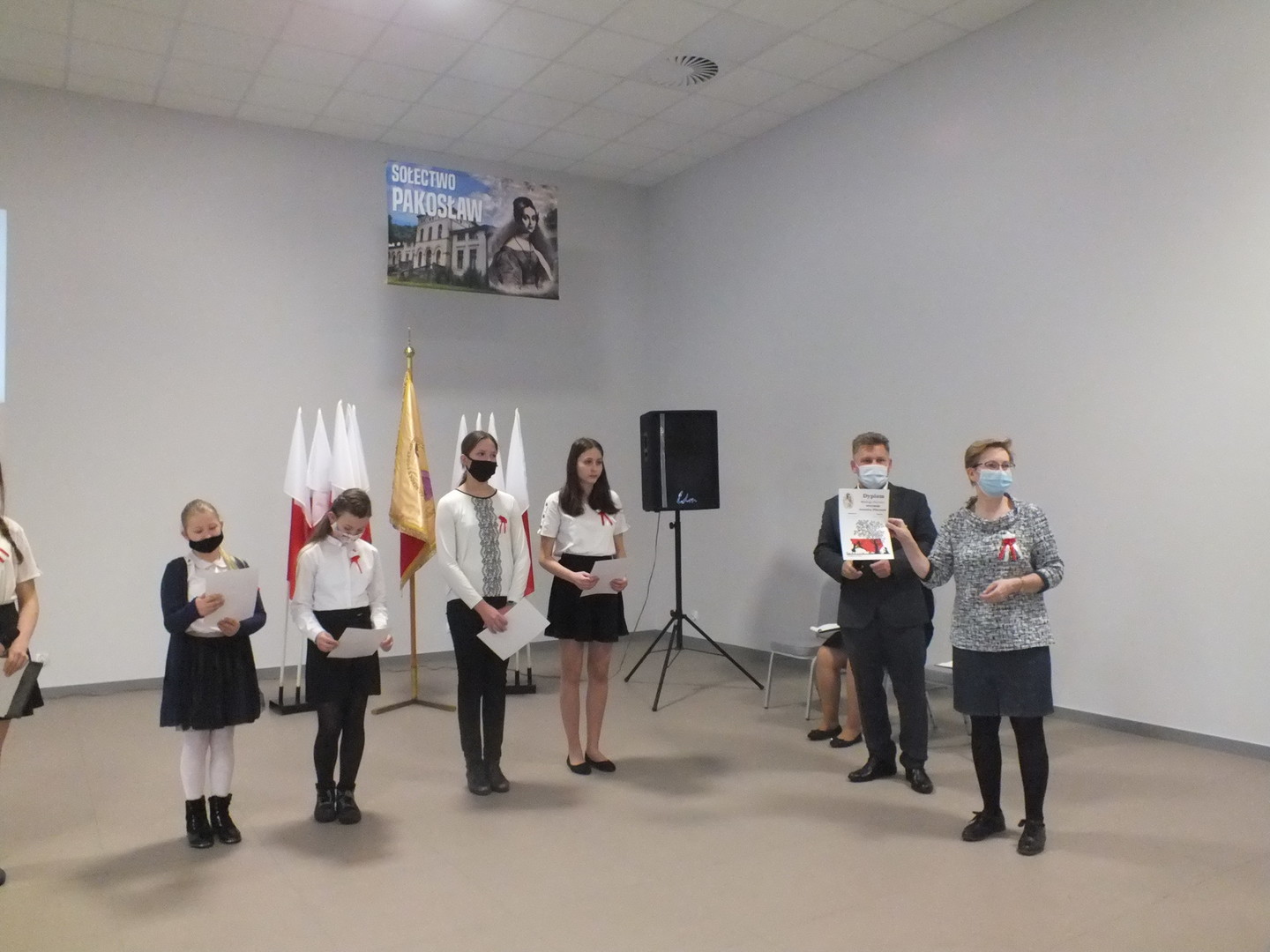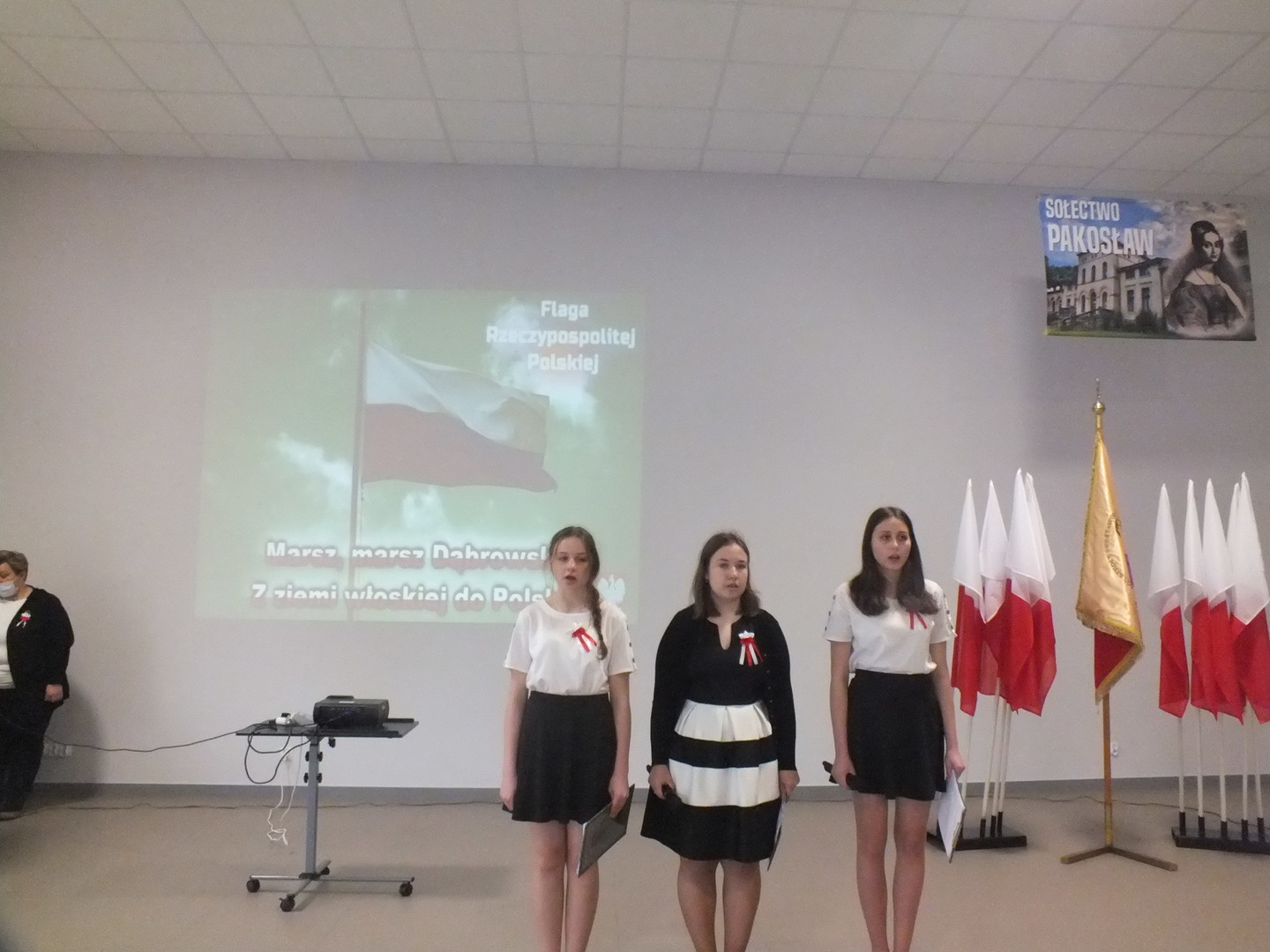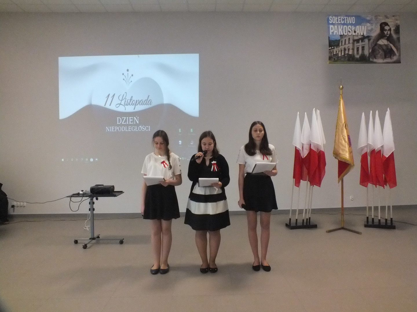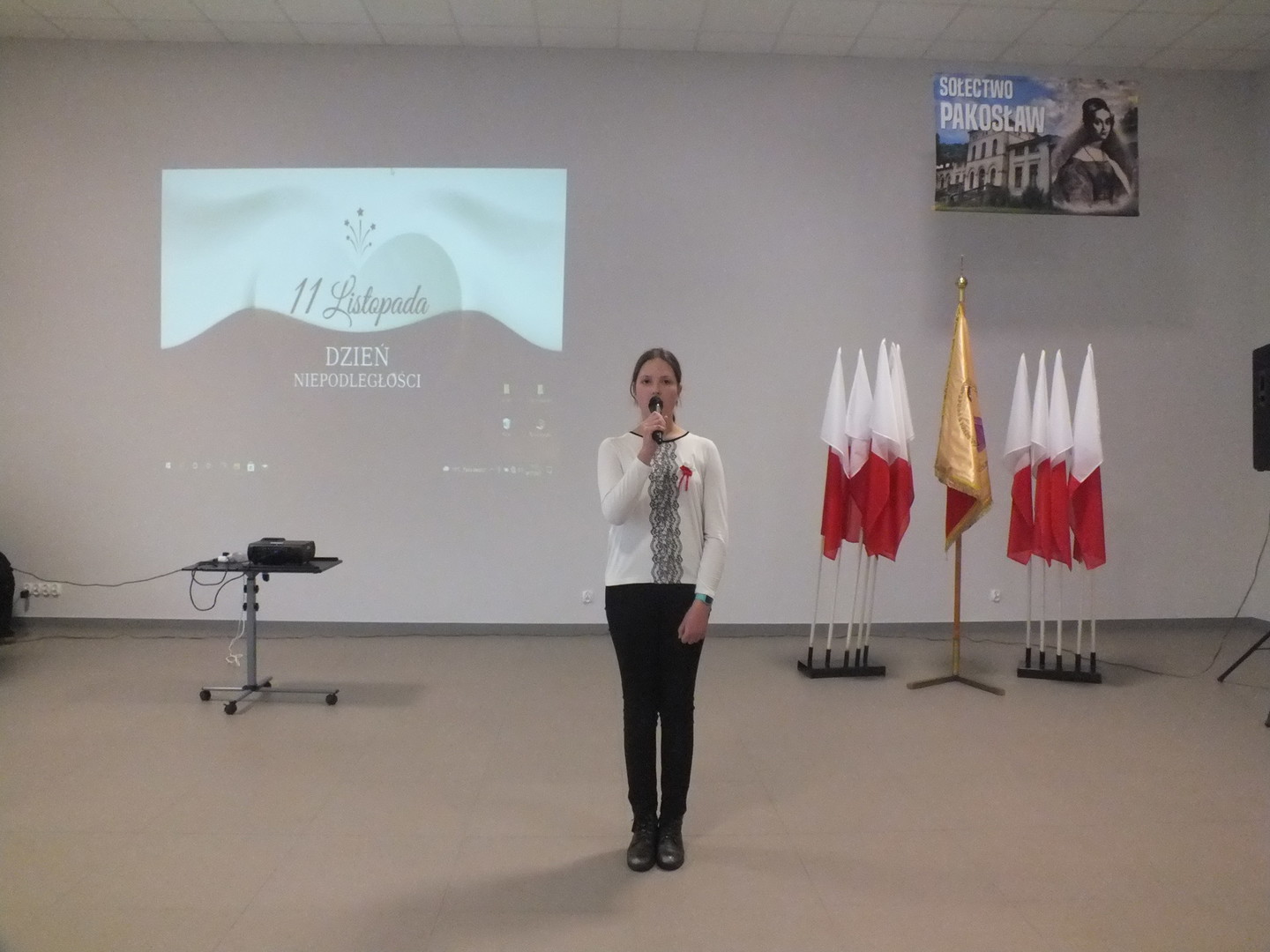 Amelia Kaczmarek, Nikola Robak, Marcelina Szarata i Oliwia Czapracka - uczennice klas 4-8 - swój patriotyzm wyraziły prezentacją wierszy. Były to utwory wyłonione w szkolnym Konkursie Recytatorskim