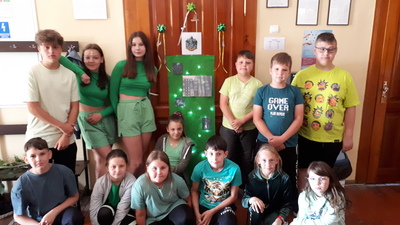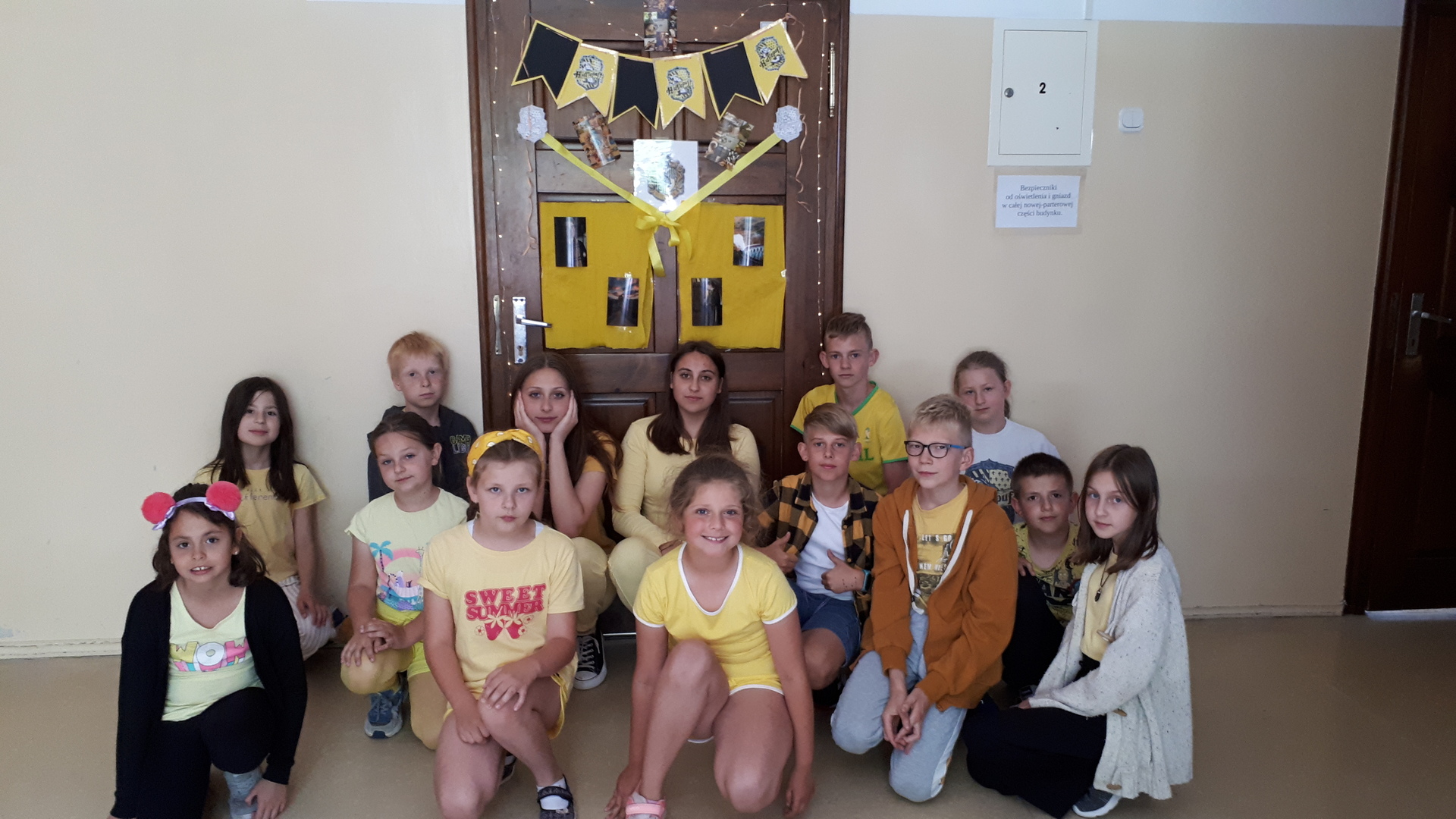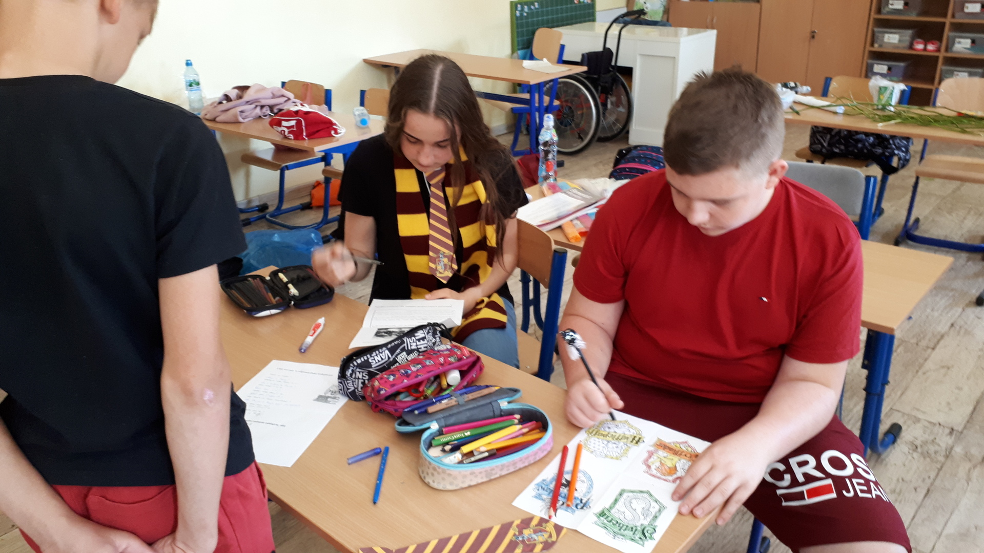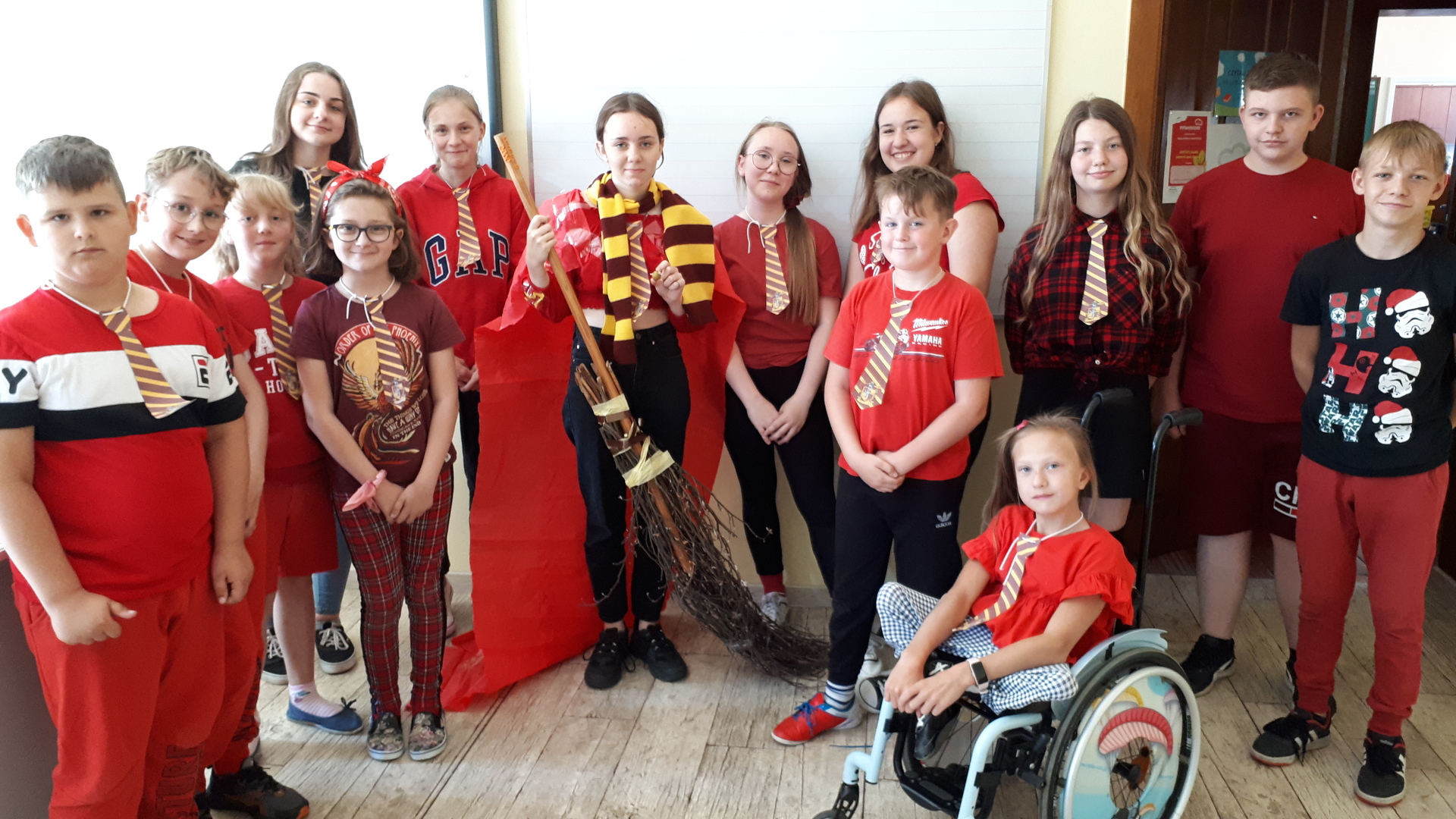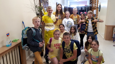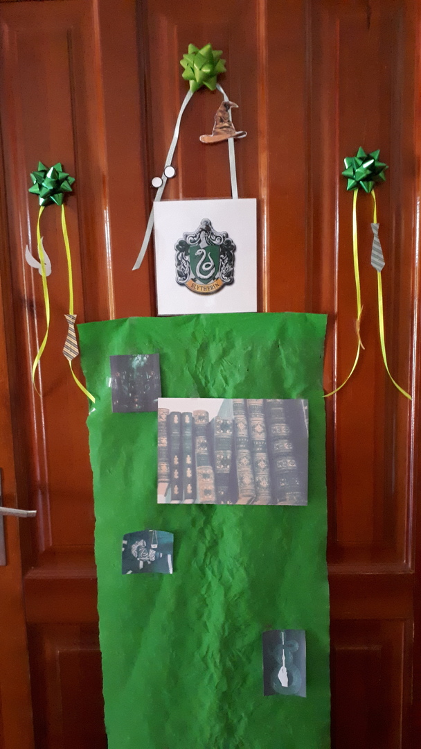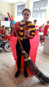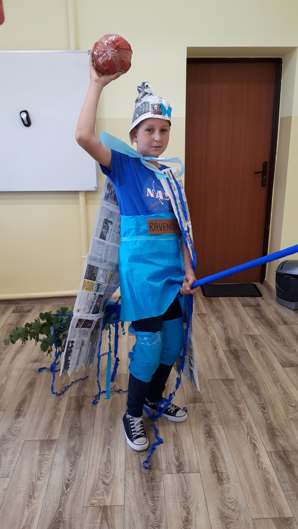 Dnia 22.06.2022 w naszej szkole został zorganizowany kolejny projekt z cyklu Dzień Angielski. Tym razem tematem przewodnim zajęć był film Harry Potter i kamień filozoficzny. Kilka dni wcześniej uczniowie wykonali test przydziału do domów w Hogwarcie. Na podstawie testu uczniowie mieli przygotować sobie strój zgodny z „domem”, do którego należą oraz udekorować drzwi „domu”.