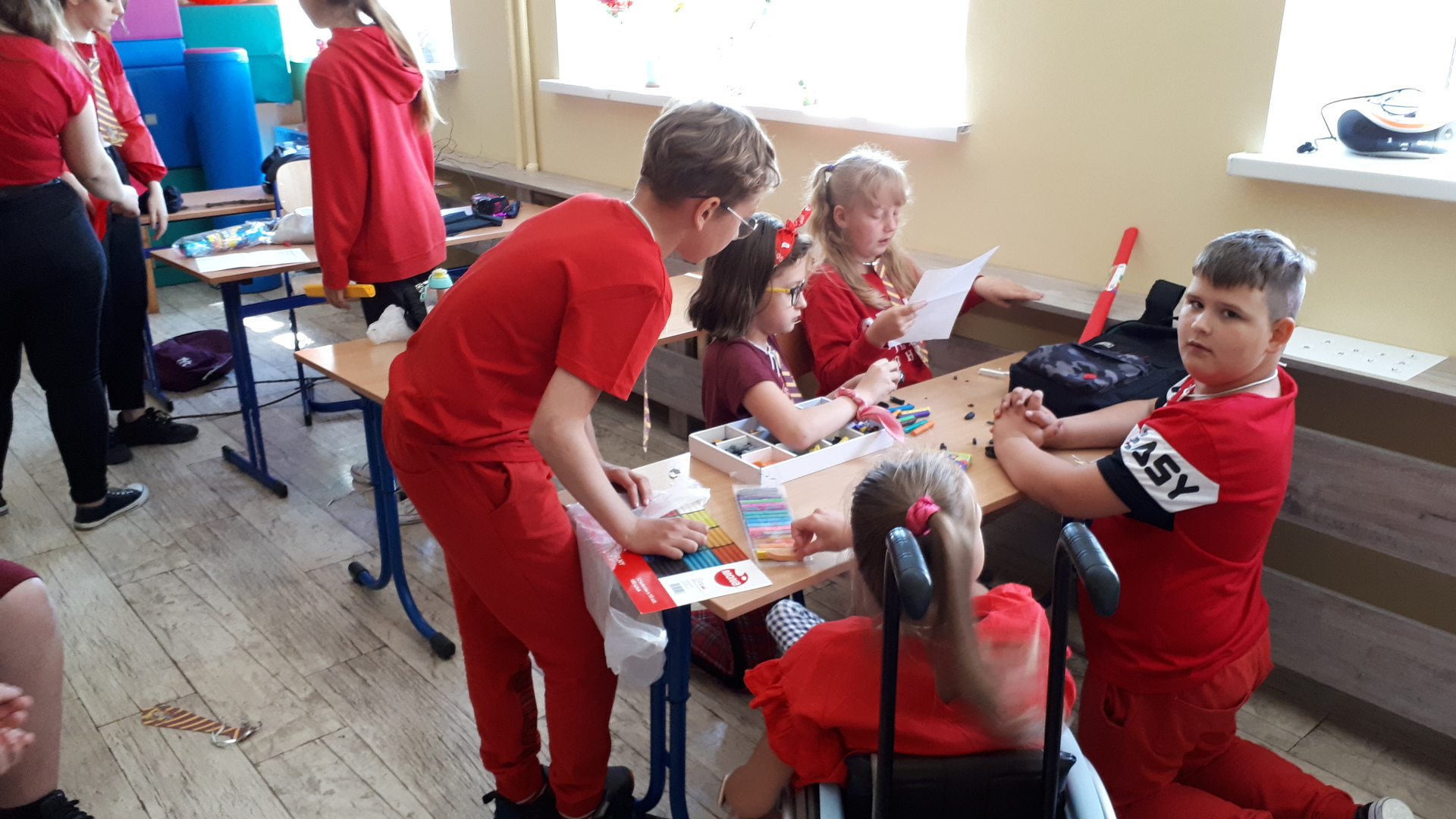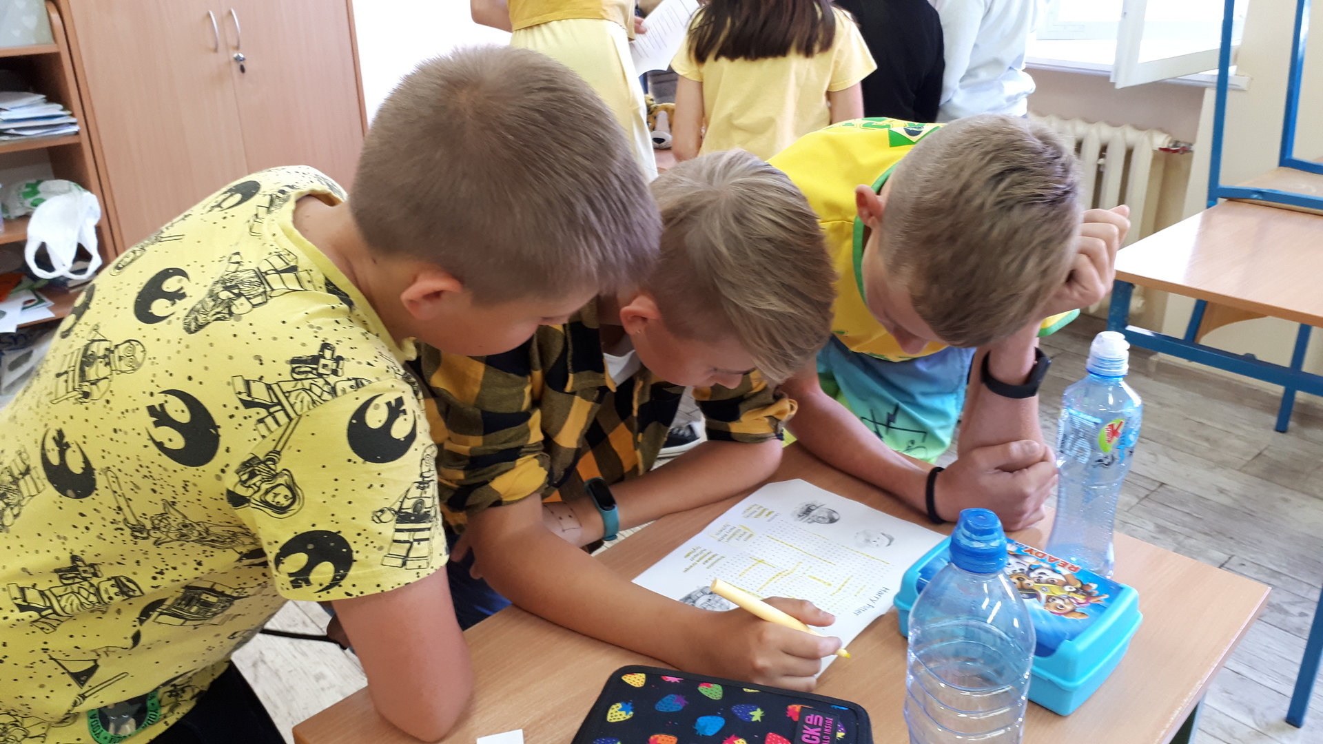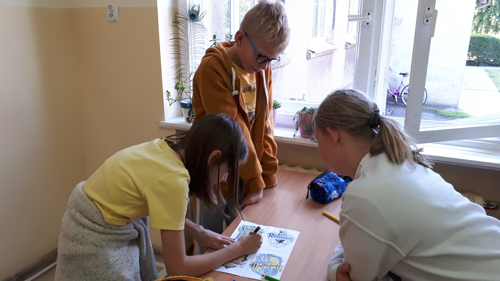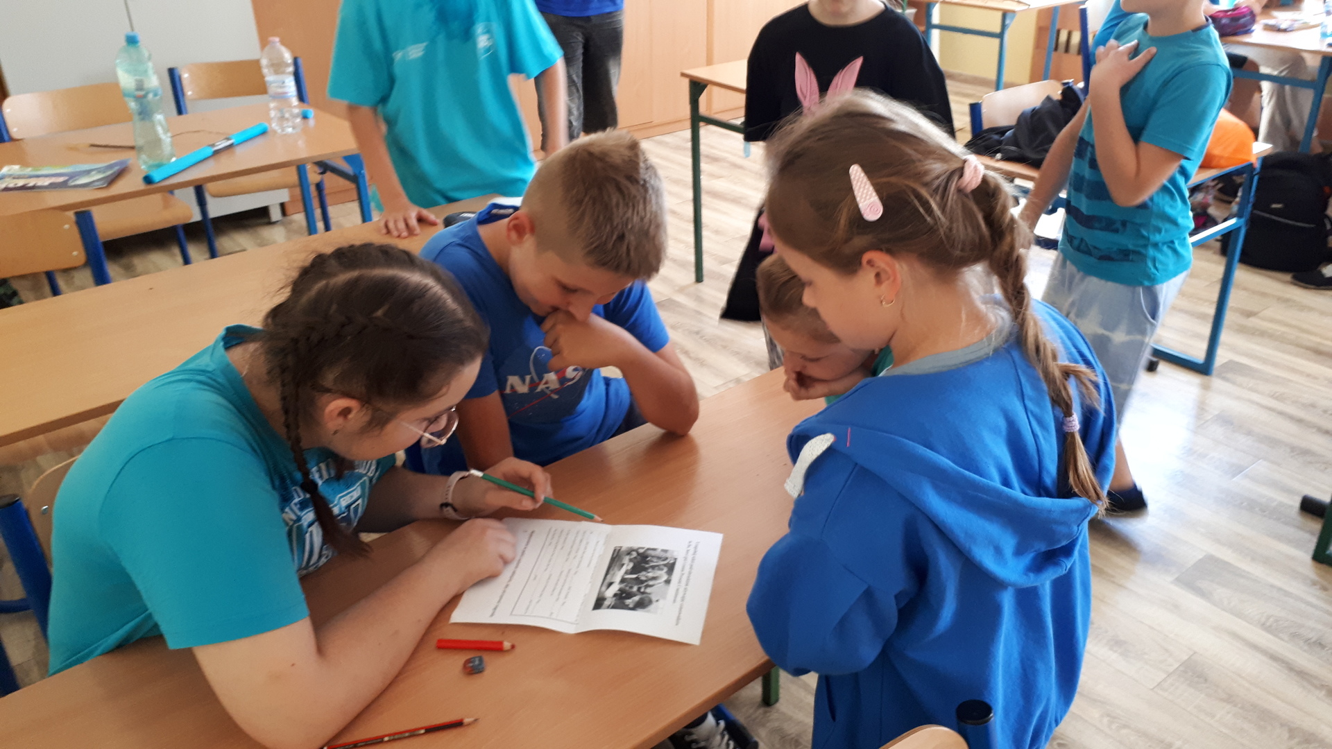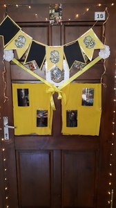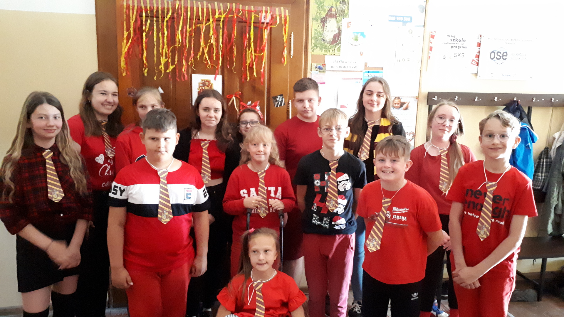 Dnia 22.06.2022 w naszej szkole został zorganizowany kolejny projekt z cyklu Dzień Angielski. Tym razem tematem przewodnim zajęć był film Harry Potter i kamień filozoficzny. Kilka dni wcześniej uczniowie wykonali test przydziału do domów w Hogwarcie. Na podstawie testu uczniowie mieli przygotować sobie strój zgodny z „domem”, do którego należą oraz udekorować drzwi „domu”.
