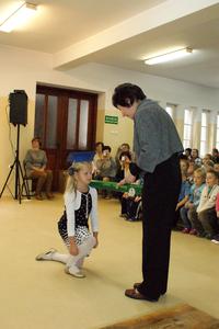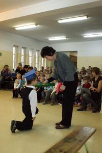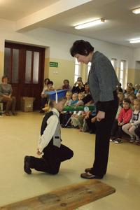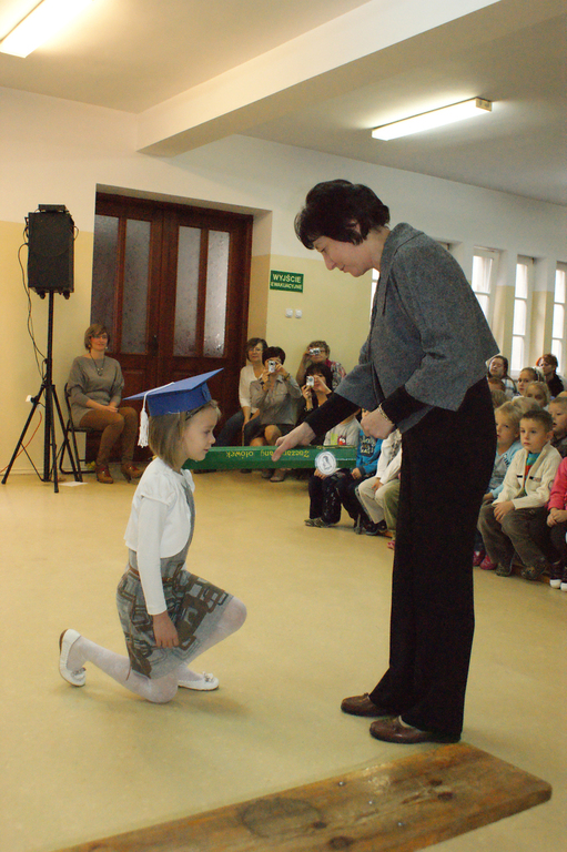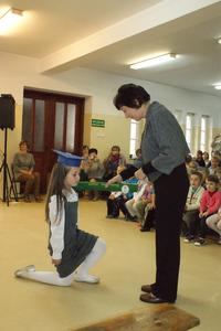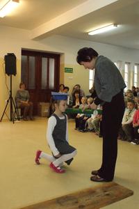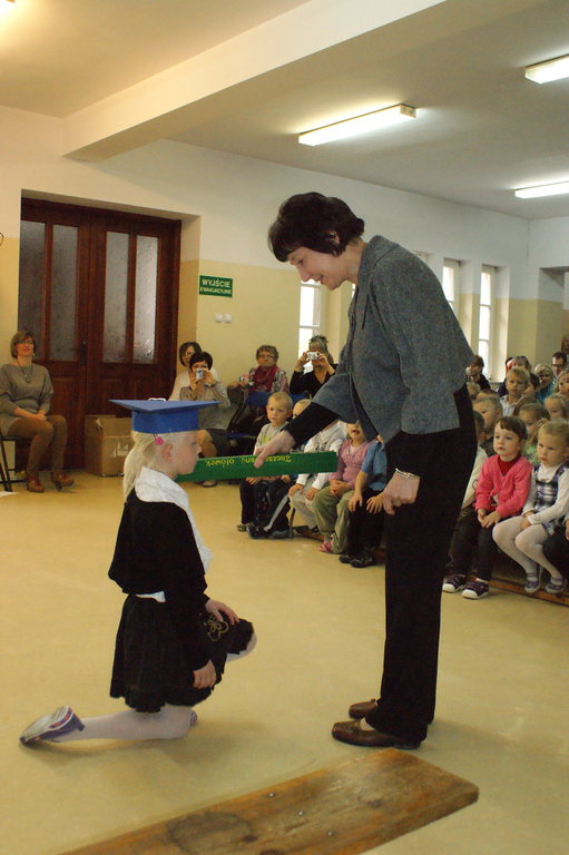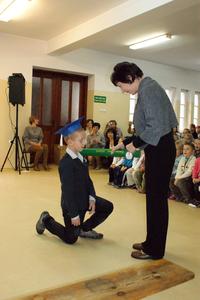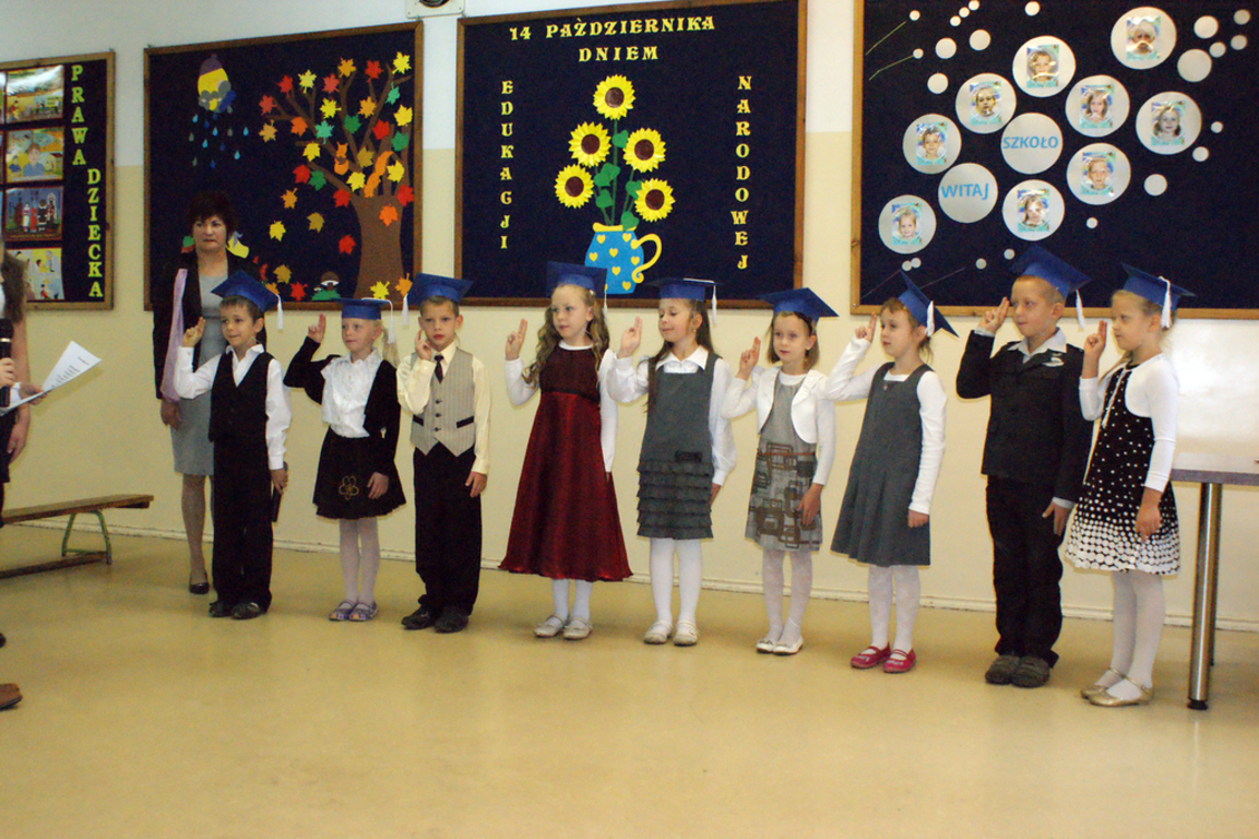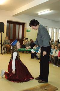 W każdej z nich uczniowie musieli wykazać się wiedzą, umiejętnościami, sprawnością . Po zdanym egzaminie ,w niezwykle podniosłej atmosferze, przed pocztem flagowym, pierwszacy ślubowali być dobrymi Polakami, godnie reprezentować swoją szkołę, swym zachowaniem i nauką sprawiać radość rodzicom i nauczycielom. Po złożeniu ślubowania pani dyrektor dokonała symbolicznego pasowania na ucznia. "Pasuję Cię na ucznia" - mówiła pani dyrektor, dotykając olbrzymim ołówkiem- jak czarodziejską różdżką ramienia każdego z uczniów.