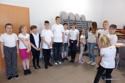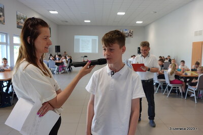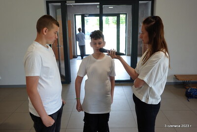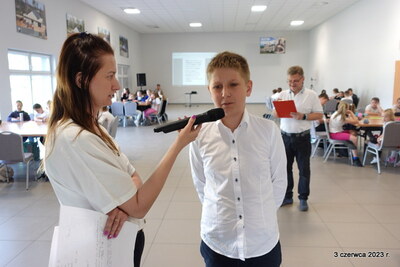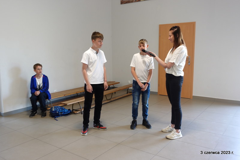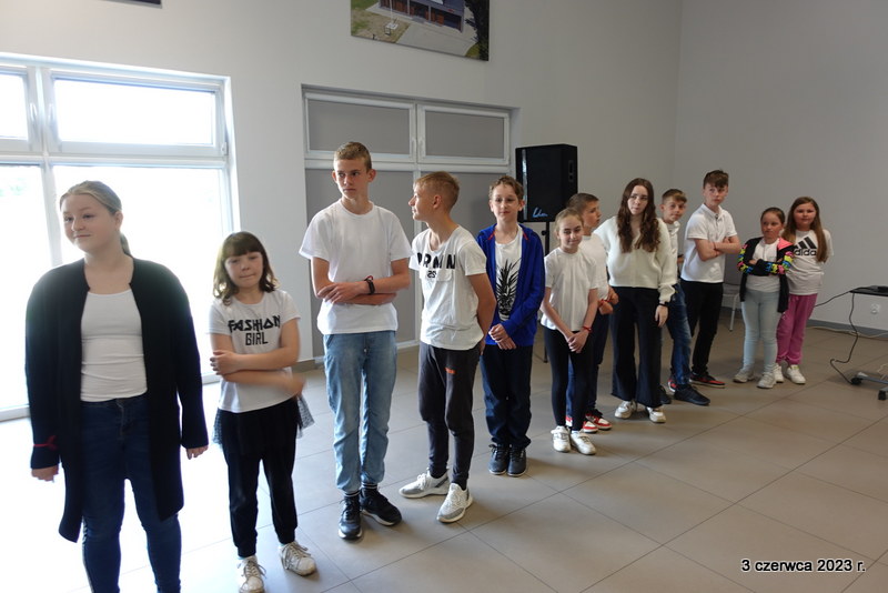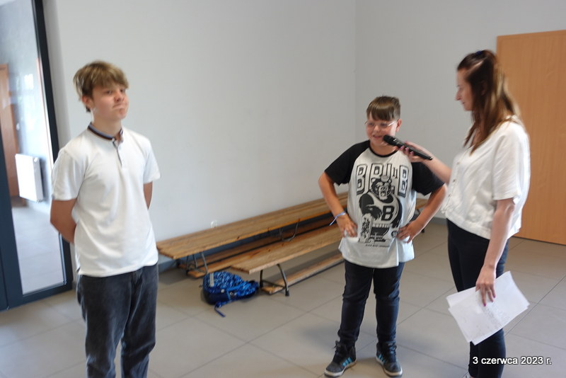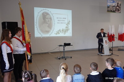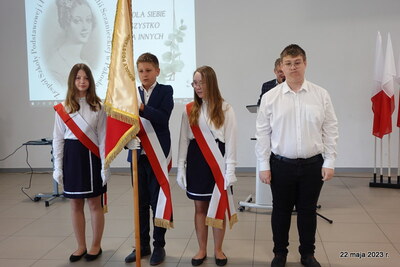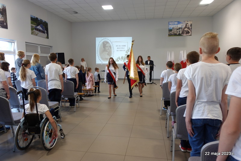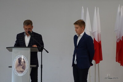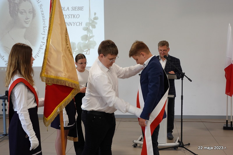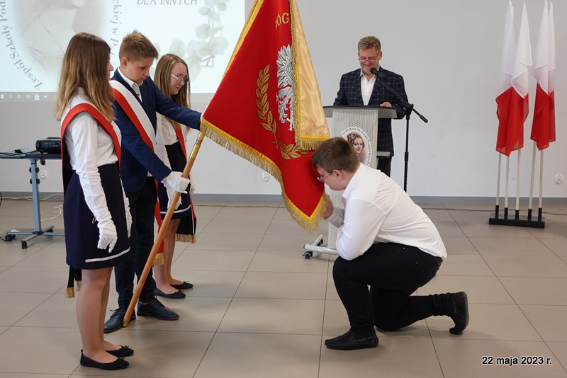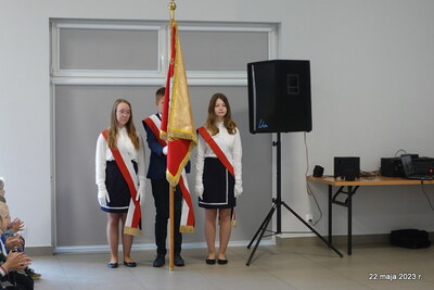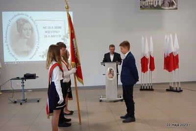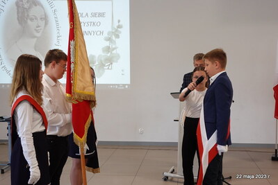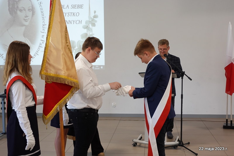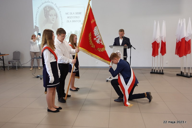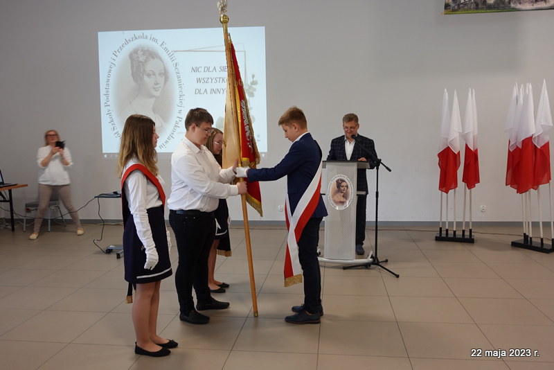 Uczeń klasy ósmej, Igor Kaczmarek, przekazał symbolicznie funkcję chorążego swemu młodszemu koledze – Marcelemu Wremblowi z klasy szóstej.
