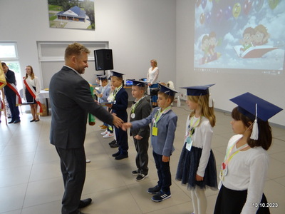 który następnie dokonał symbolicznym ołówkiem aktu pasowania na ucznia Szkoły