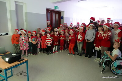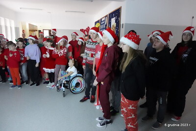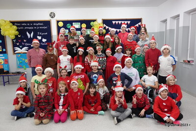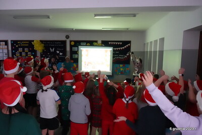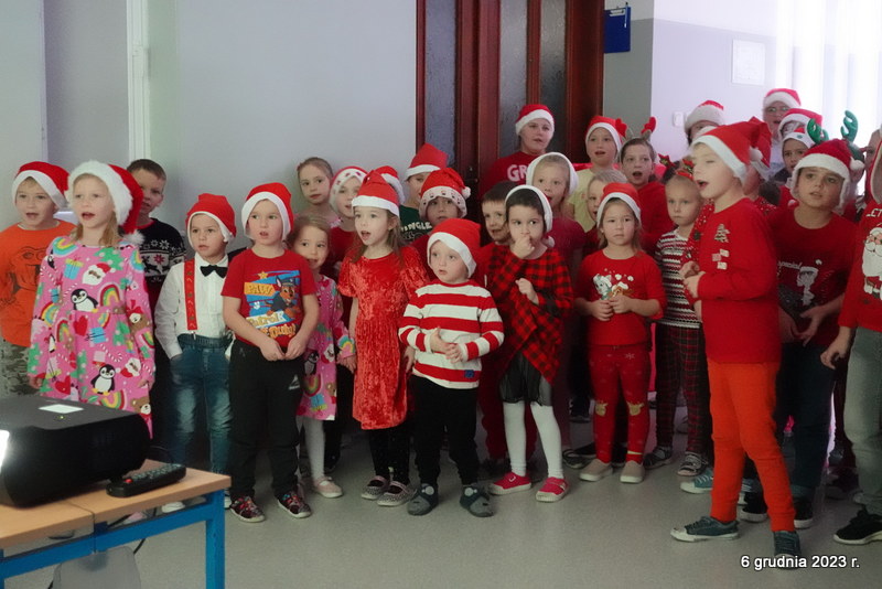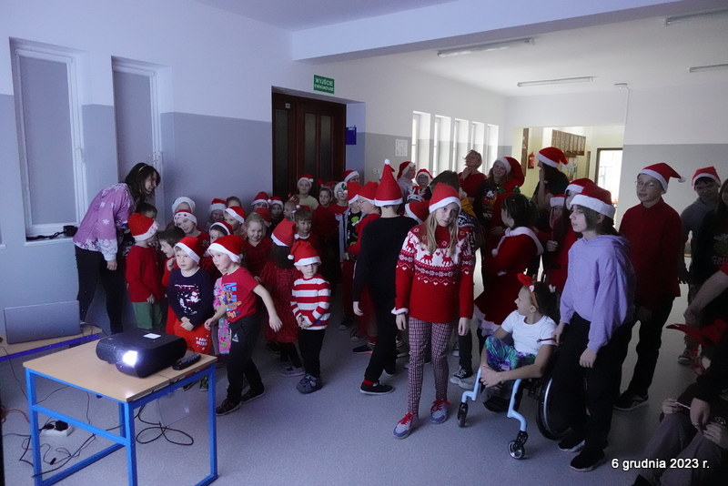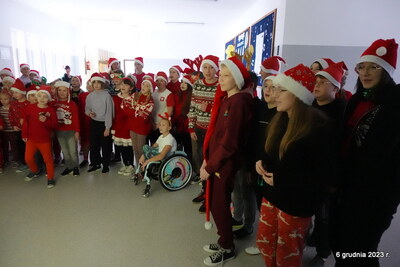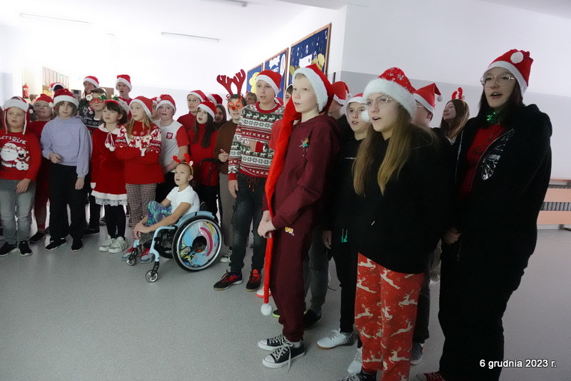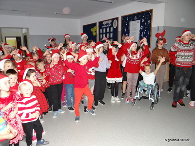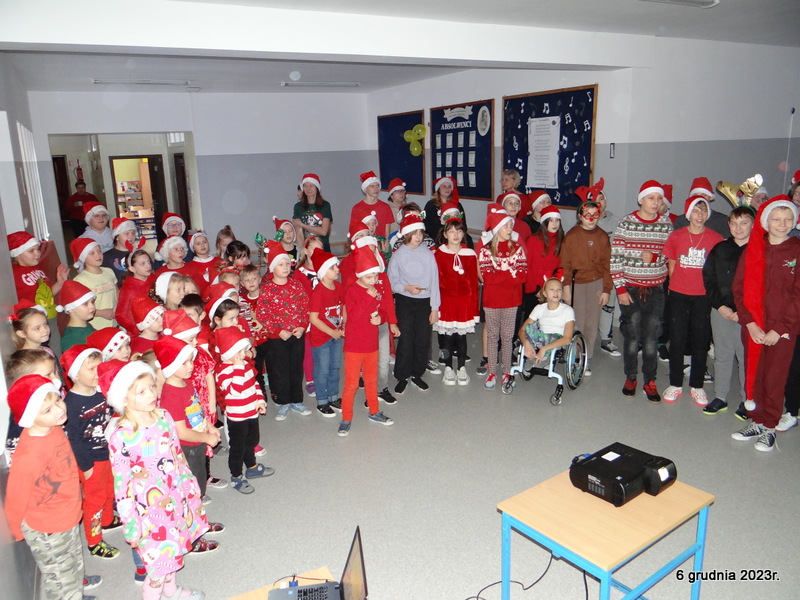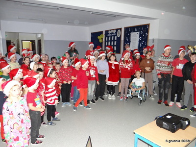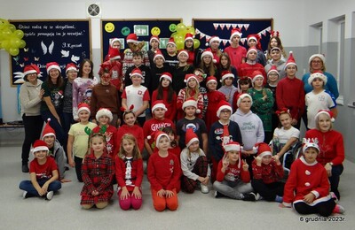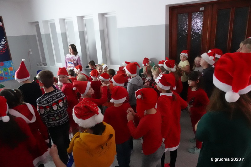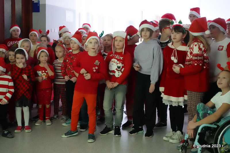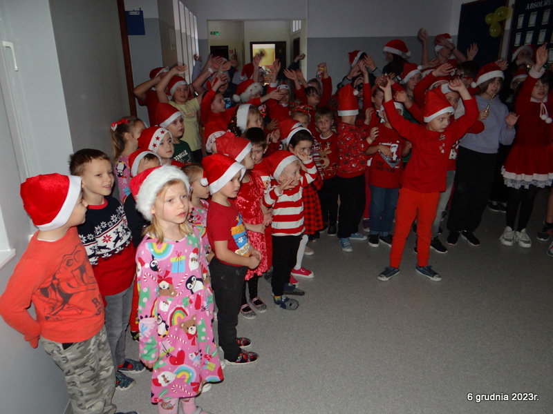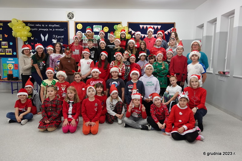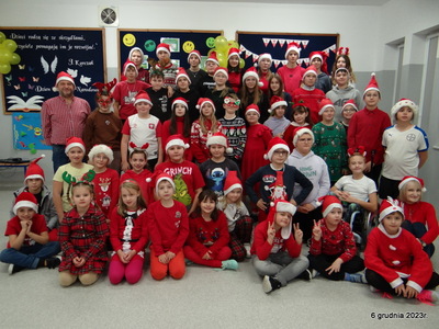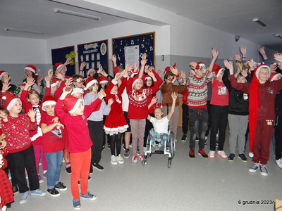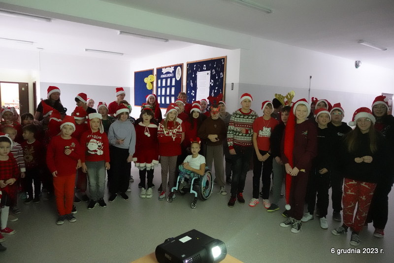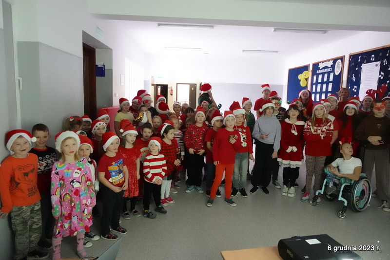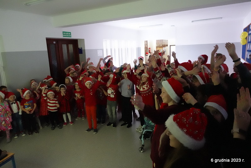 W dniu dzisiejszym uczniowie naszej szkoły hucznie obchodzili Mikołajki. Zgodnie z naszą szkolną tradycją wszyscy uczniowie, nauczyciele i pozostali pracownicy szkoły, przebrali się w stroje mikołajkowe. W szkole zaroiło się od czerwonych nakryć głowy, świątecznych sweterków i sukienek. W trakcie dużej przerwy wszyscy zebrali się w holu, aby wspólnie zaśpiewać świąteczną piosenkę Jingle Bells. Zabawa rozkręciła się na dobre i przerodziła w śpiewanie kolejnych piosenek i tańce. Wszyscy świetnie się bawili, a świąteczny nastrój udzielał się cały dzień.