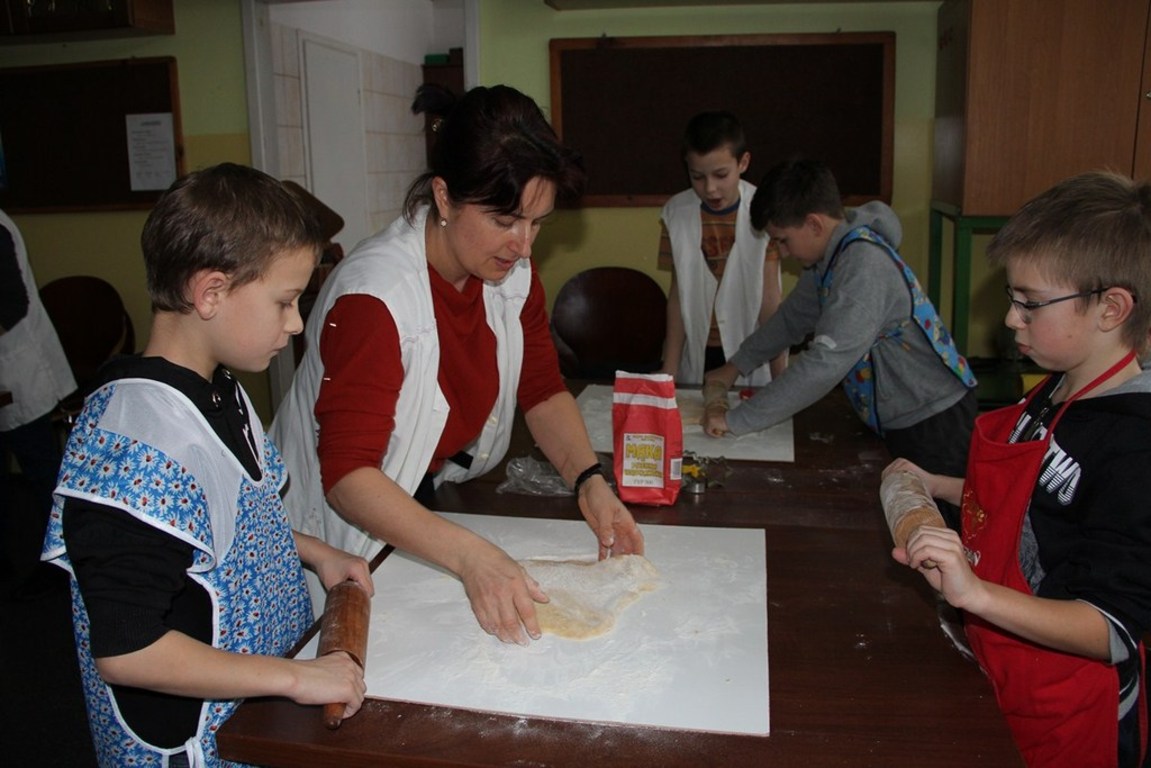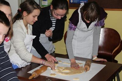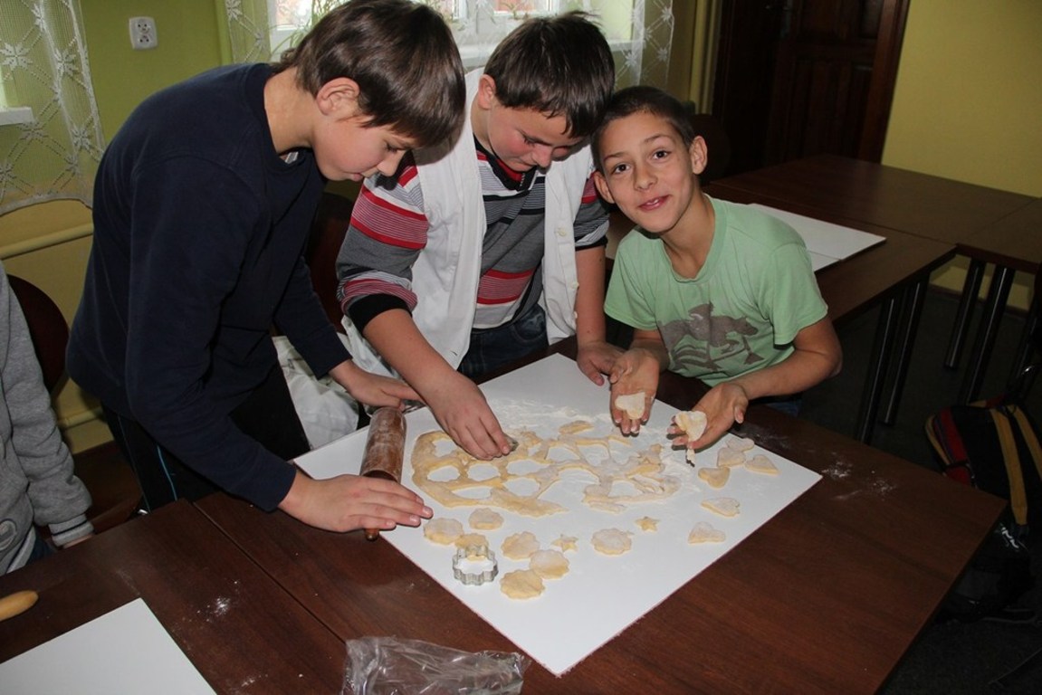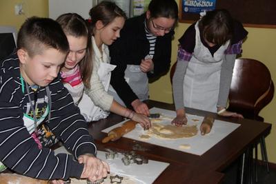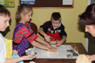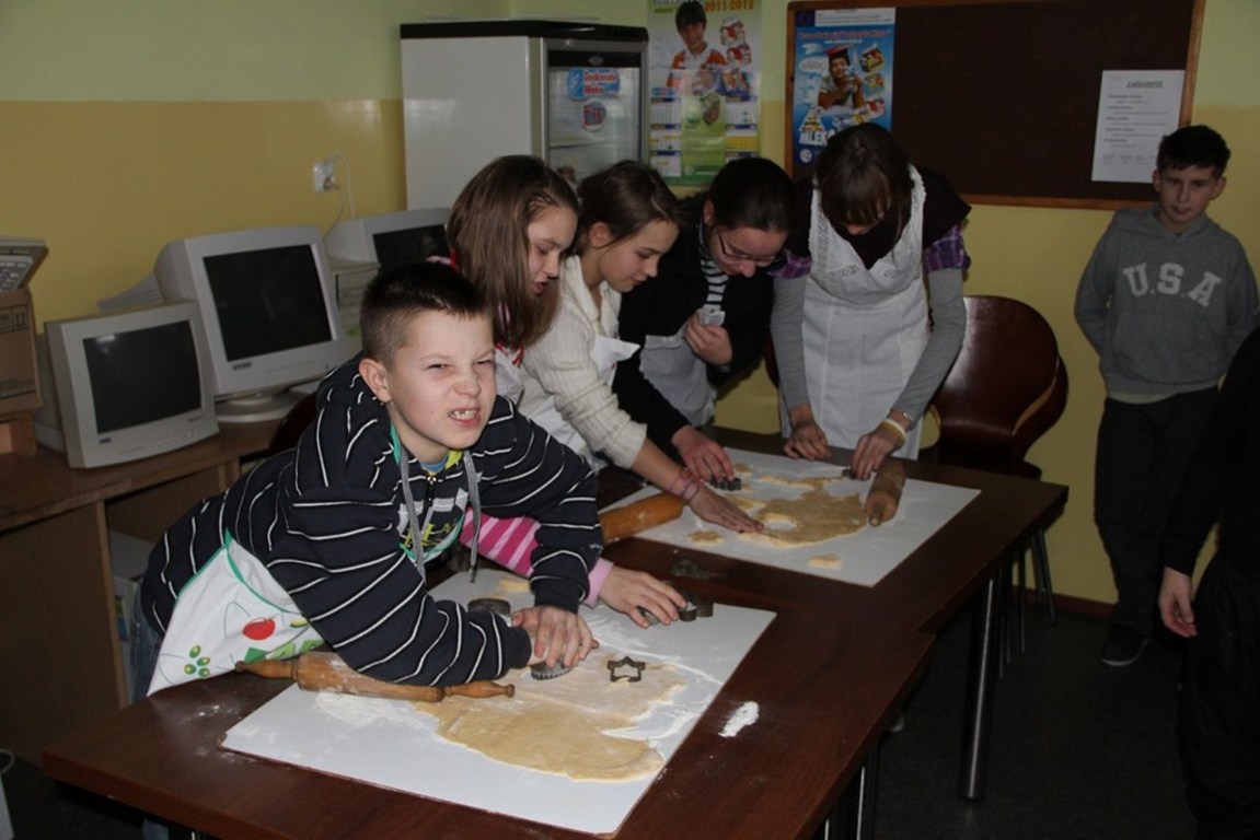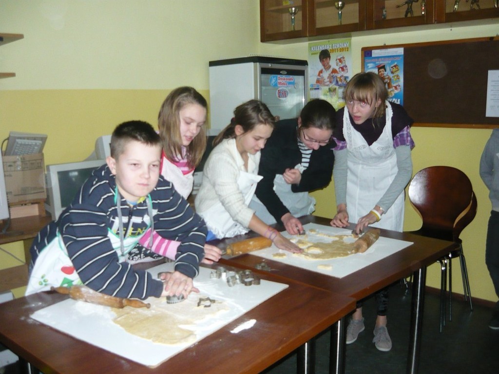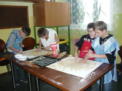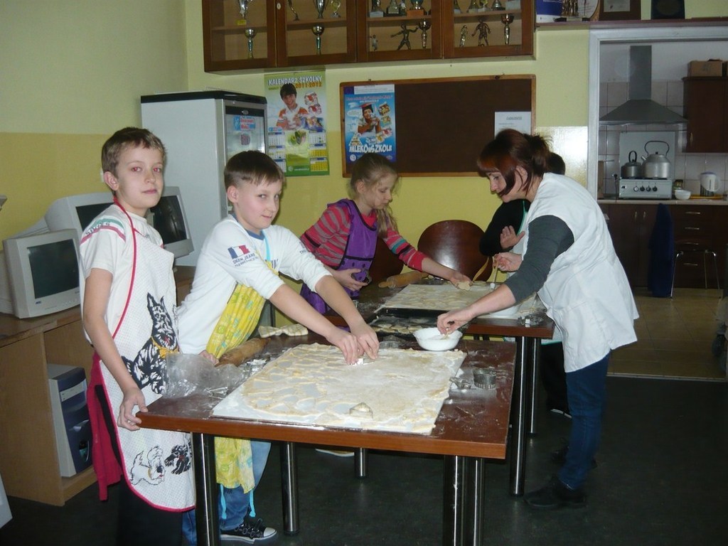 Klasa VI i IV przygotowywała i piekła przepyszne ciasteczka oraz stroiła pierniki, które mają być spożywane podczas klasowych wigilii oraz świąt. Przygotowaniem pieczenia zajęły się mamy uczniów: pani E. Stachowiak i p.A. Pruszkowska, które nadzorowały prace uczniów polegające na ugniataniu ciasta, wycinaniu foremkami w cieście różnych kształtów a następnie na cukrzeniu ciastek. Dodatkowo uczniowie zdobili pierniki lukrem oraz różnego rodzaju posypkami.