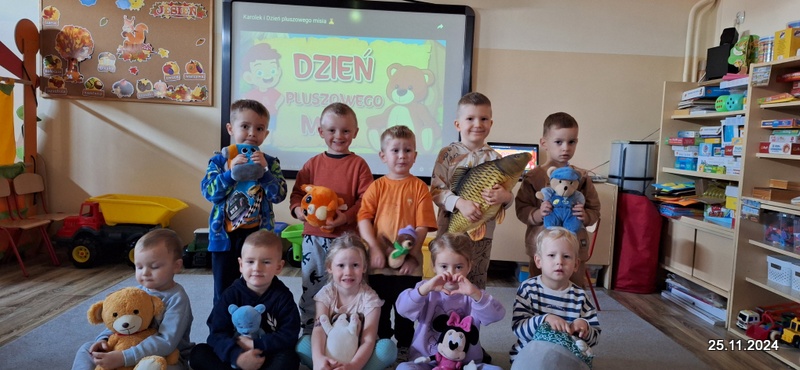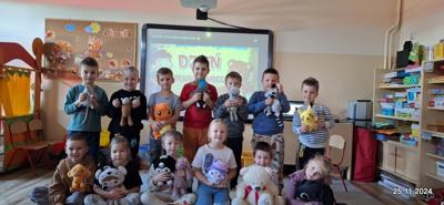 25 listopada 2024r. Każdy przedszkolak przyprowadził swojego pluszowego przyjaciela. Dzieci chętnie zaprezentowały przyniesioną zabawkę. Cały dzień poświęcony był misiowym zabawom. Podczas oglądania filmu edukacyjnego poznały różne gatunki niedźwiedzi i historię pluszowego misia. Panie kucharki przygotowały słodką niespodziankę, ciasteczko w kształcie misia.