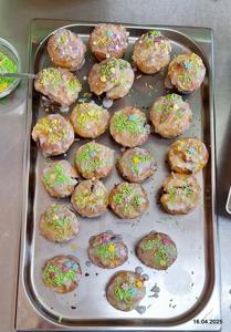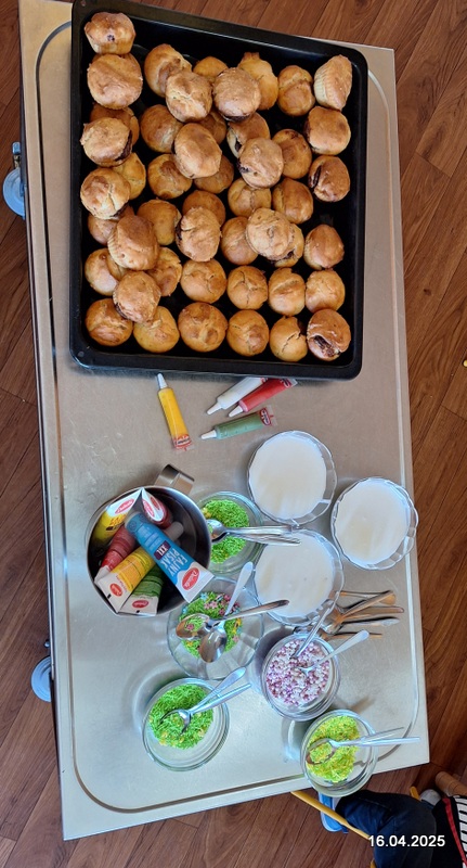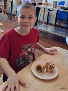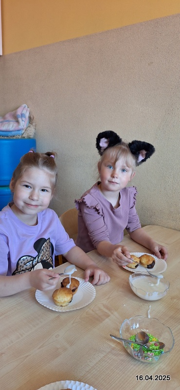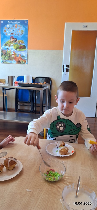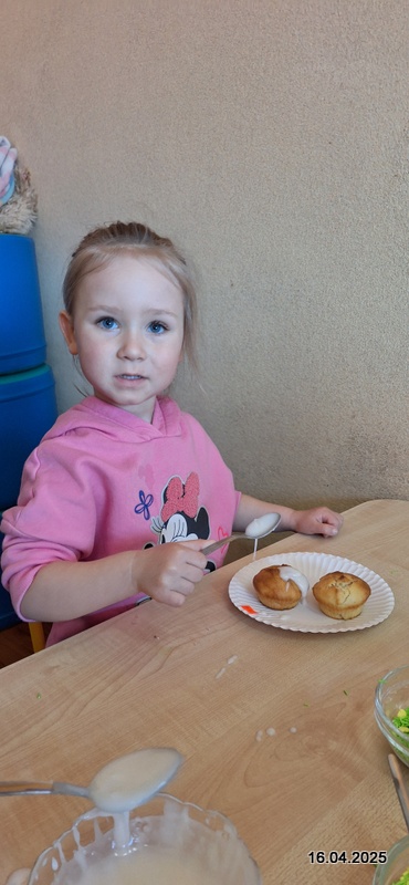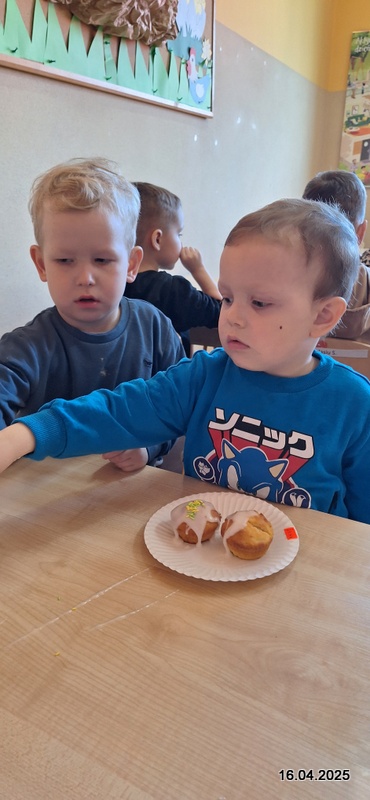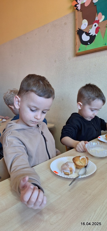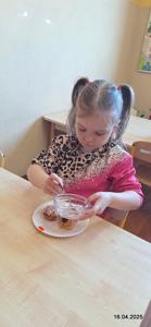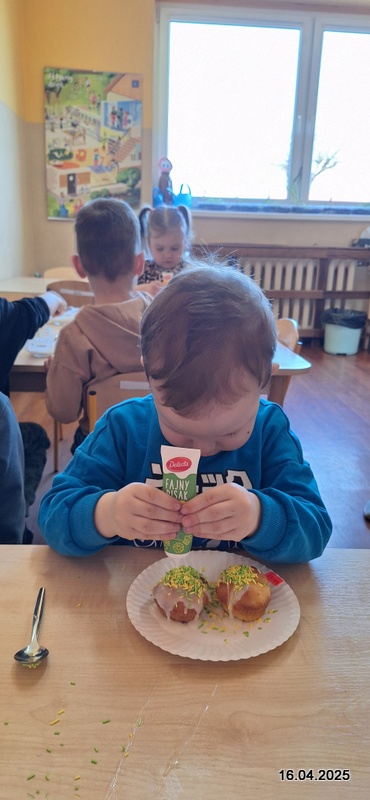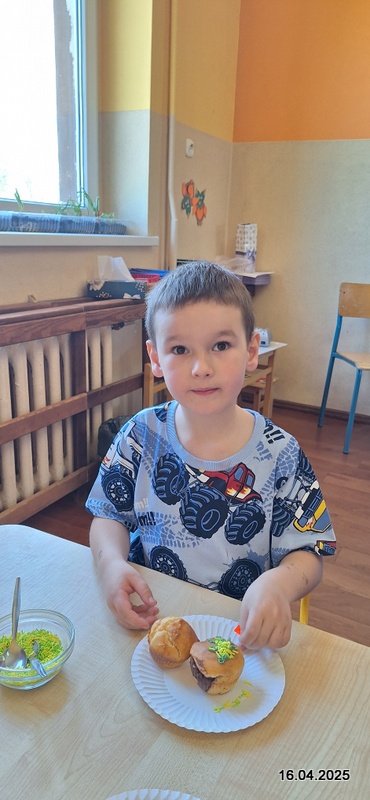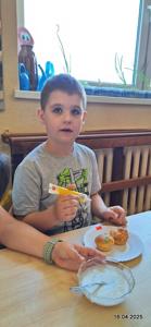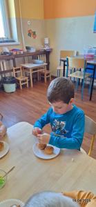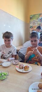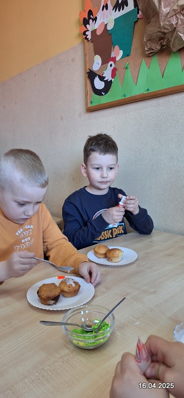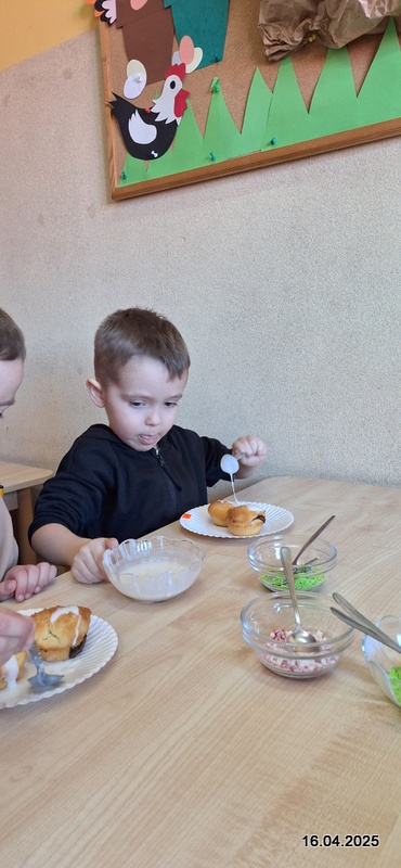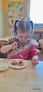 i dekoracji. Przedszkolacy własnoręcznie dekorowały upieczone babeczki, malowały jajka, wyklejały zajączki, koszyczki wielkanocne oraz posiały rzeżuchę.