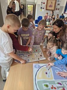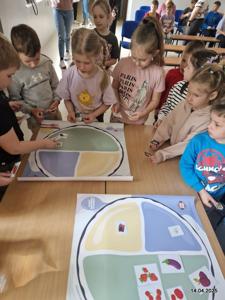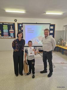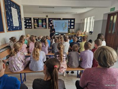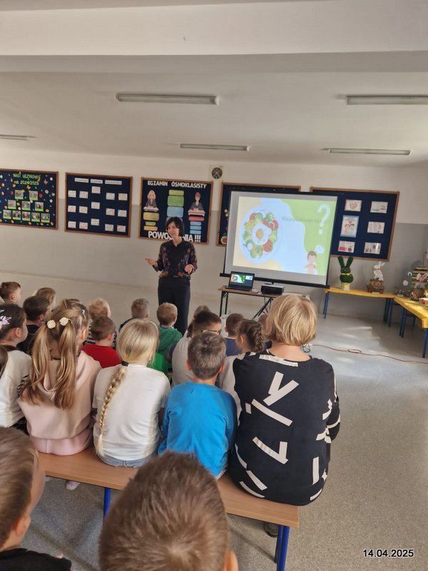 W poniedziałek 14 kwietnia 2025 roku odwiedziła nas Pani Karolina Józefiak z nowotomyskiego sanepidu. Pani Karolina przeprowadziła prelekcję dla przedszkolaków i uczniów klas I-III w ramach projektu „ Talerz zdrowego żywienia”. Dzieci miały możliwość wykazania się swoją wiedzą biorąc udział klasyfikowaniu żywności na talerzu. Laureaci konkursu plastycznego „Super śniadanie”, który odbył się w marcu , otrzymali nagrody rzeczowe. Nagrody odebrali: Jakub Jarmarczyk i Adrianna Szuba. Gratulujemy osiągnięć i zachęcamy do udziału w konkursach.