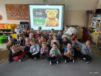 26 listopada 2025 r. w naszym przedszkolu świętowaliśmy Dzień Pluszowego Misia – dzień pełen radości, uśmiechów i kreatywnych działań. Każde dziecko mogło spędzić ten wyjątkowy czas w towarzystwie swojego ulubionego pluszowego przyjaciela. W ramach obchodów wybraliśmy się na spotkanie do biblioteki, gdzie dzieci poznały ciekawe historie o misiach, wysłuchały bajek i z ogromnym zainteresowaniem oglądały książki poświęcone tym sympatycznym bohaterom. Była to doskonała okazja do rozwijania miłości do czytania oraz poznawania świata literatury. Kolejną atrakcją były zajęcia plastyczne, podczas których dzieci poznały nową technikę malarską – „rosnące misie”. Prace powstawały z wielkim za angażowaniem, a efekty twórczych działań zachwycały kolorami i pomysłowością. Na zakończenie dnia na dzieci czekała miła niespodzianka – każdy przedszkolak otrzymał breloczek z misiem oraz pyszne ciasteczko w kształcie misia, przygotowane specjalnie przez nasze wspaniałe panie kucharki. Słodki upominek był pięknym zwieńczeniem tego radosnego święta. Dzień Pluszowego Misia na długo pozostanie w naszej pamięci jako czas wspólnej zabawy, nauki i uśmiechu.