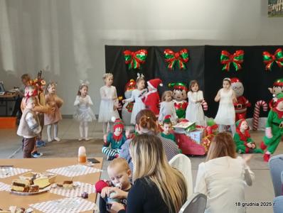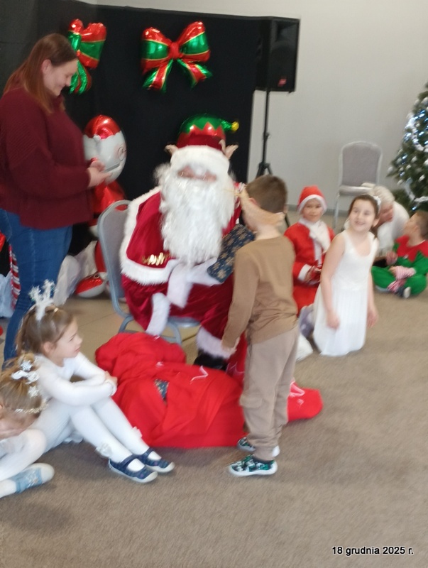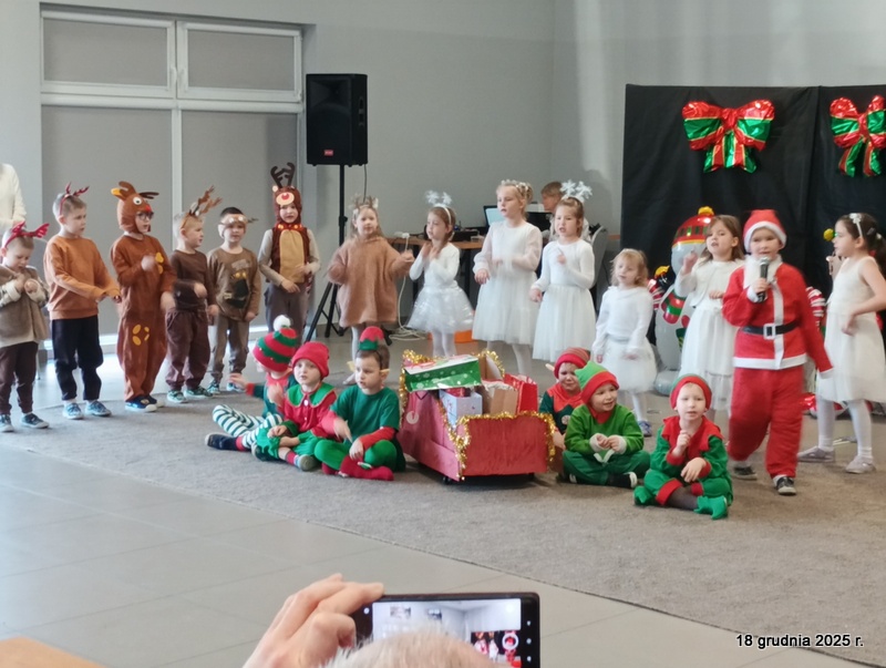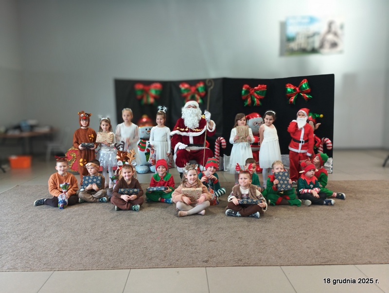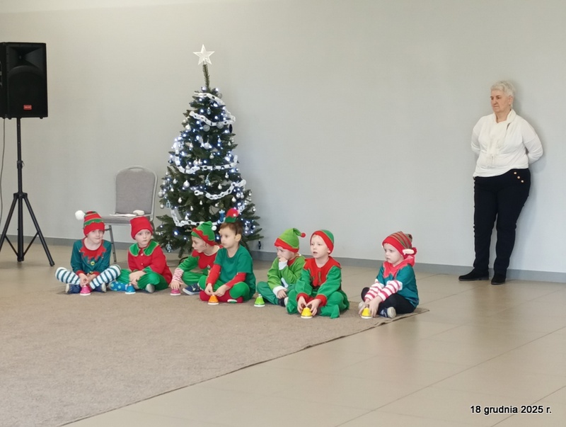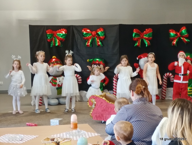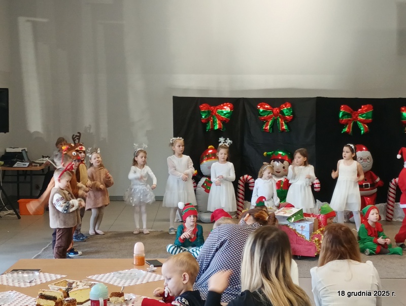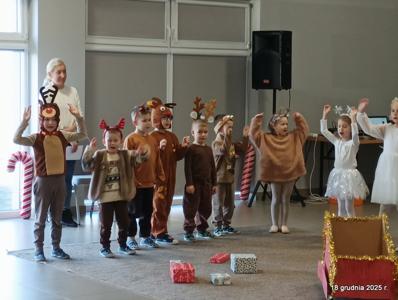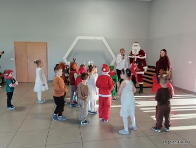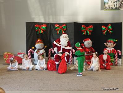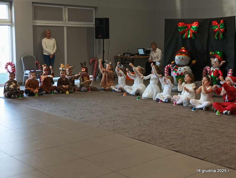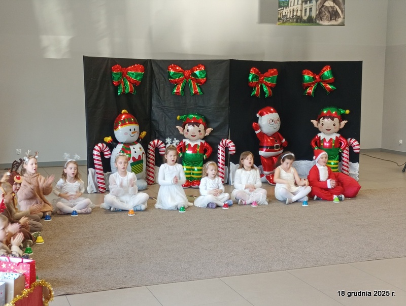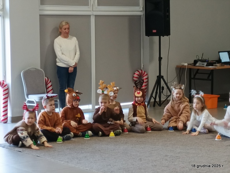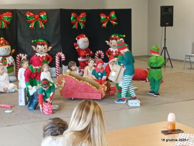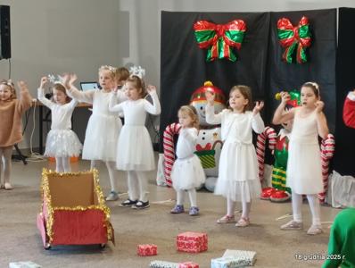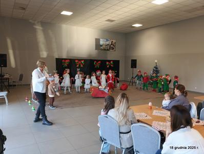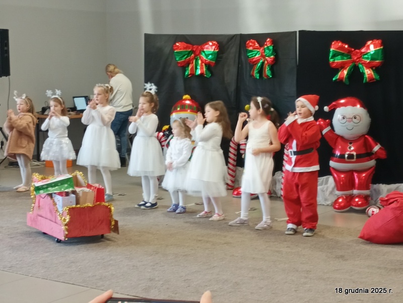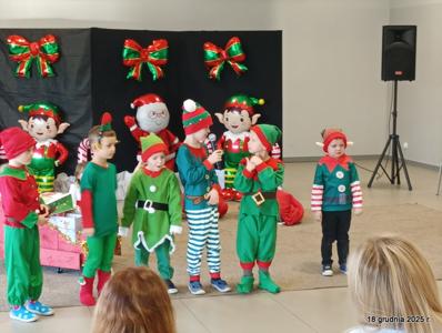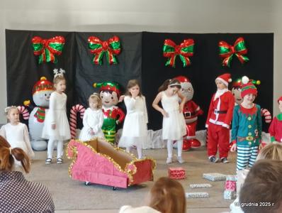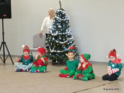 18 grudnia 2025r. w naszym przedszkolu odbyło się świąteczne spotkanie przy choince z udziałem dzieci i rodziców. Przedszkolaki zaprezentowały występy artystyczne pt. "Mikołajowe prezenty" i po raz pierwszy zagrały na dzwoneczkach. Dzieci z powodzeniem pokonały tremę i z wielkim zaangażowaniem zaprezentowały się na scenie, zachwycając widzów pięknym występem. W trakcie spotkania dzieci odwiedził Gwiazdor i otrzymały prezenty. Następnie wszyscy uczestnicy zostali zaproszeni na poczęstunek.