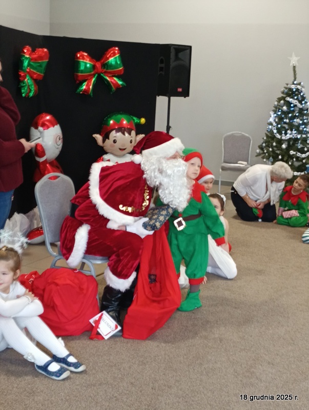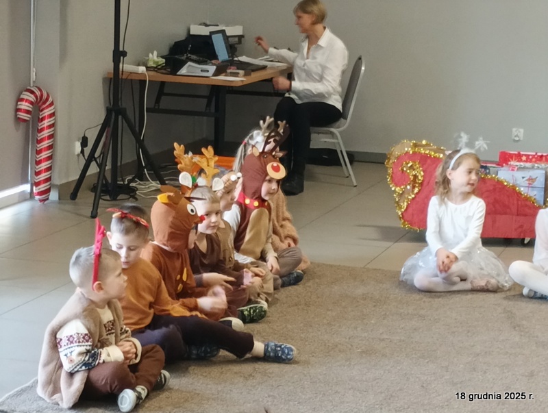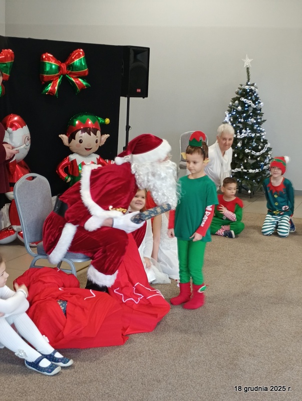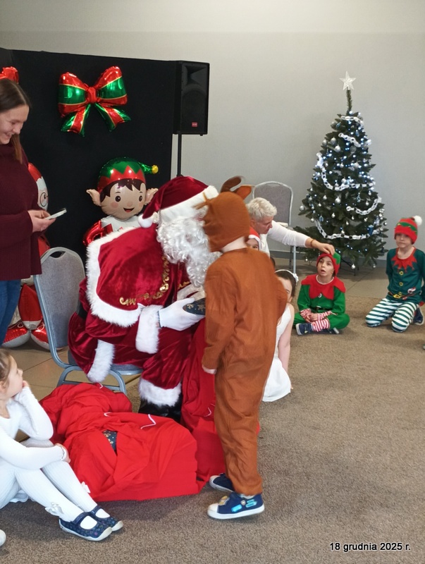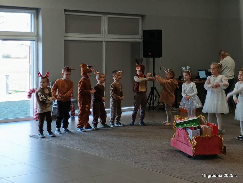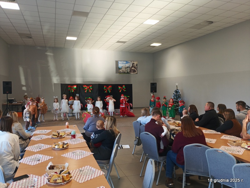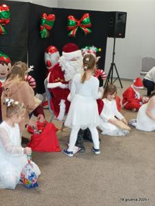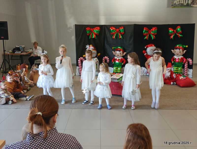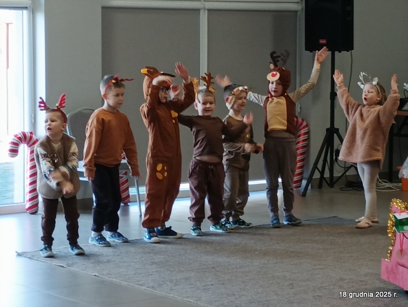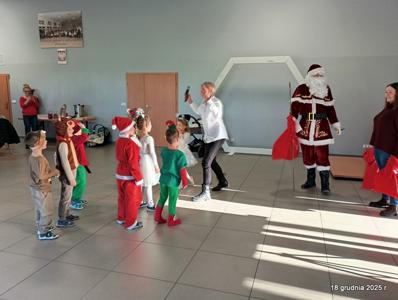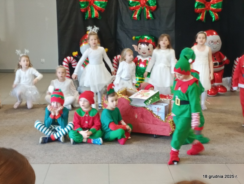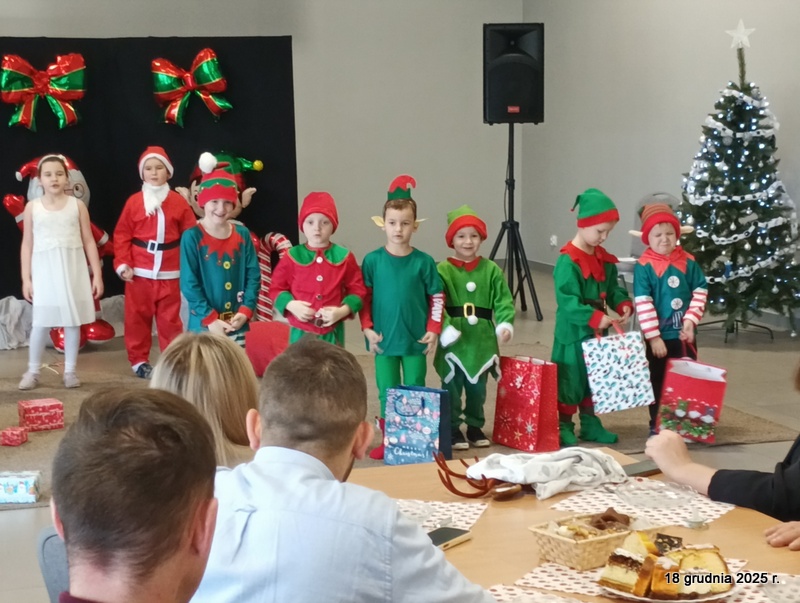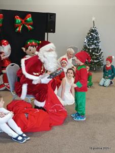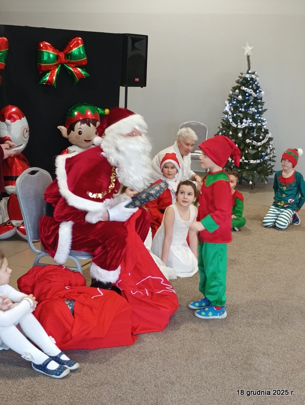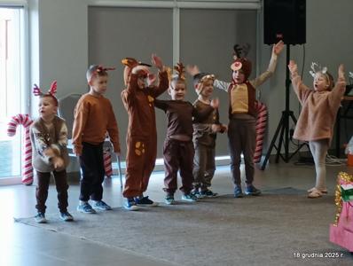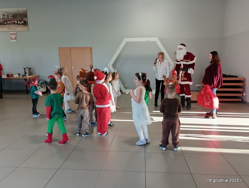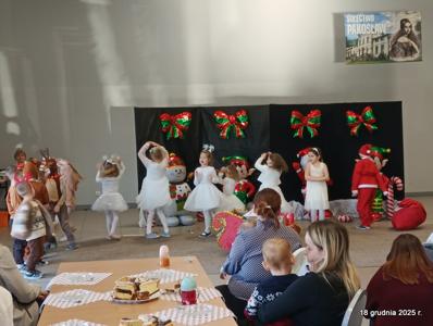 18 grudnia 2025r. w naszym przedszkolu odbyło się świąteczne spotkanie przy choince z udziałem dzieci i rodziców. Przedszkolaki zaprezentowały występy artystyczne pt. "Mikołajowe prezenty" i po raz pierwszy zagrały na dzwoneczkach. Dzieci z powodzeniem pokonały tremę i z wielkim zaangażowaniem zaprezentowały się na scenie, zachwycając widzów pięknym występem. W trakcie spotkania dzieci odwiedził Gwiazdor i otrzymały prezenty. Następnie wszyscy uczestnicy zostali zaproszeni na poczęstunek.