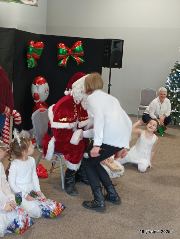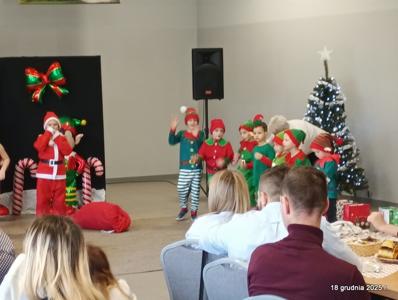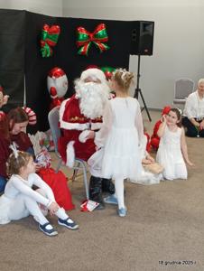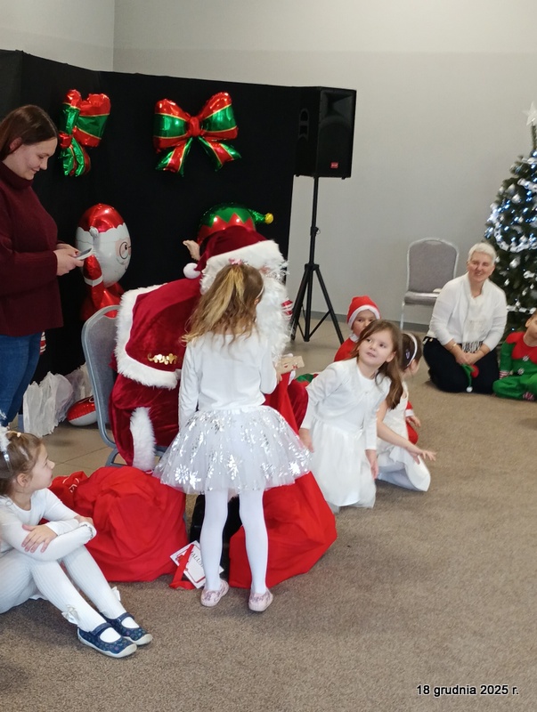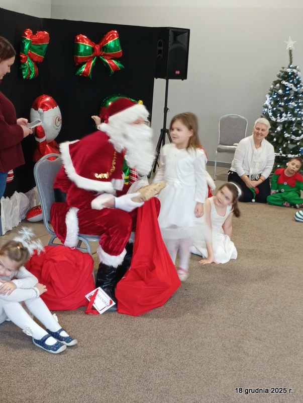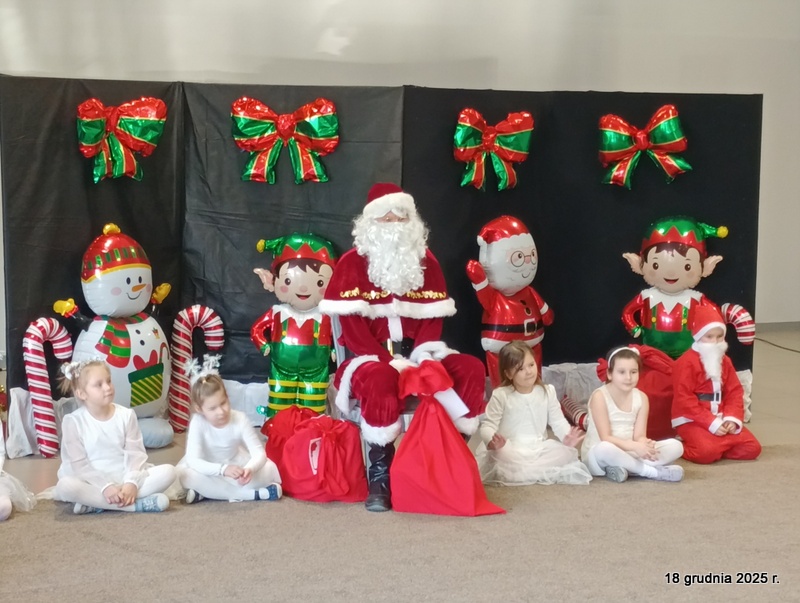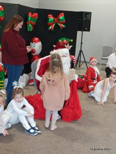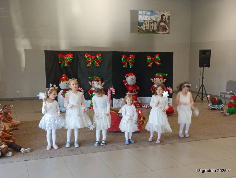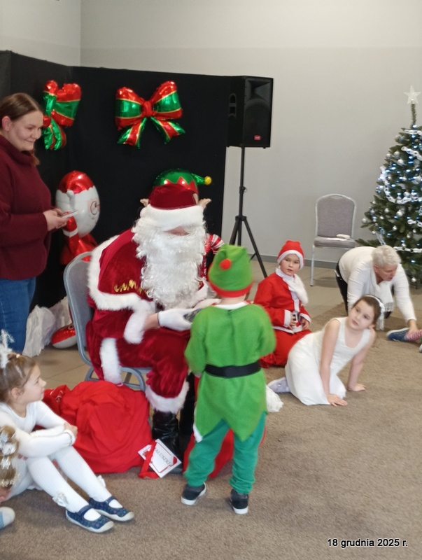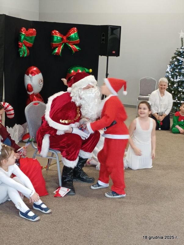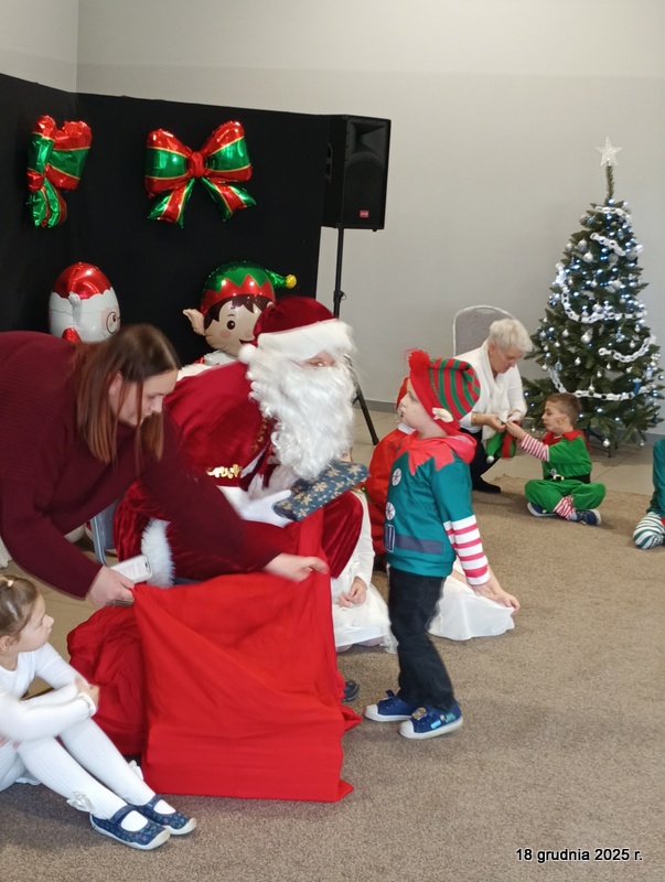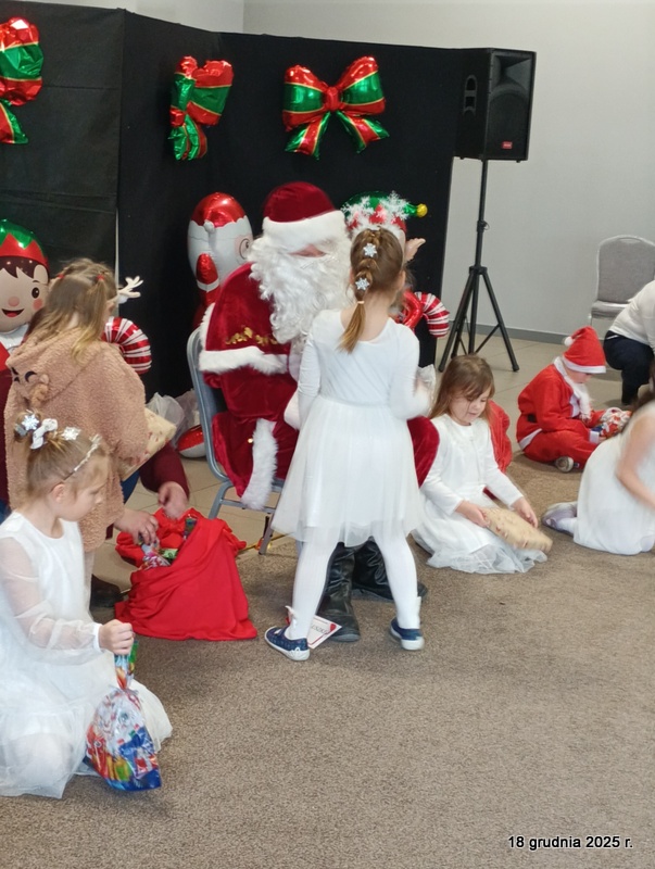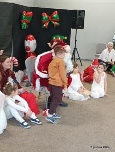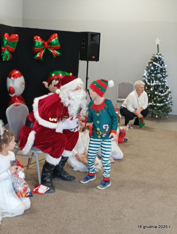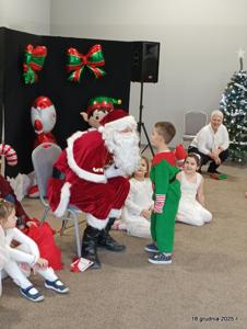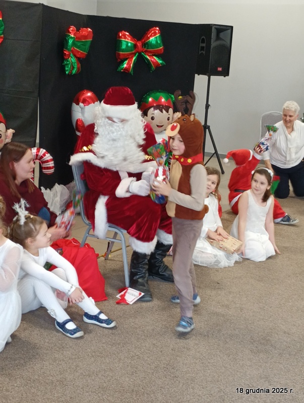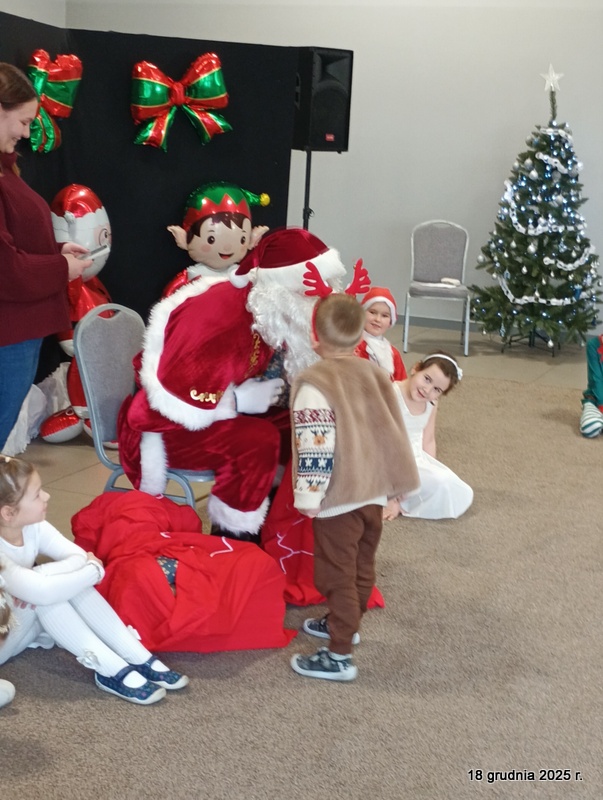 18 grudnia 2025r. w naszym przedszkolu odbyło się świąteczne spotkanie przy choince z udziałem dzieci i rodziców. Przedszkolaki zaprezentowały występy artystyczne pt. "Mikołajowe prezenty" i po raz pierwszy zagrały na dzwoneczkach. Dzieci z powodzeniem pokonały tremę i z wielkim zaangażowaniem zaprezentowały się na scenie, zachwycając widzów pięknym występem. W trakcie spotkania dzieci odwiedził Gwiazdor i otrzymały prezenty. Następnie wszyscy uczestnicy zostali zaproszeni na poczęstunek.