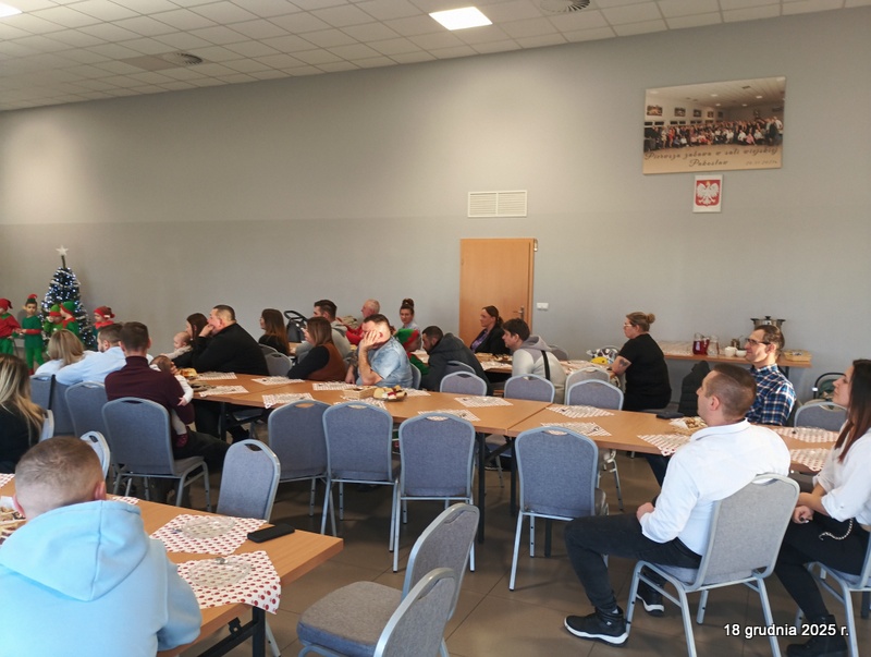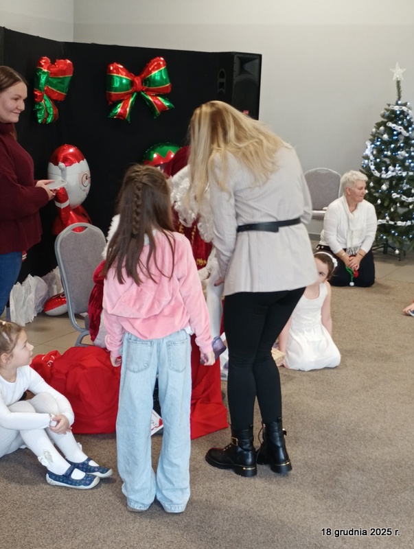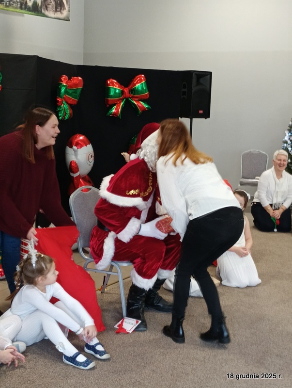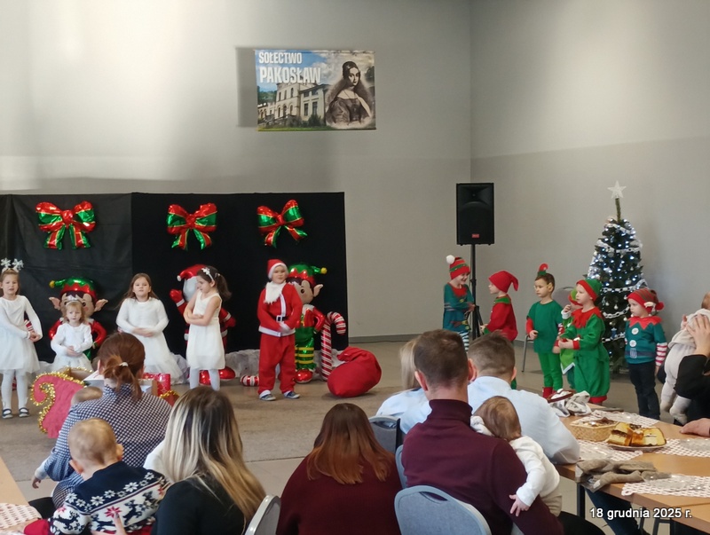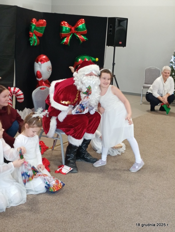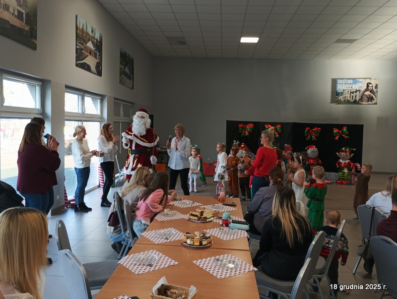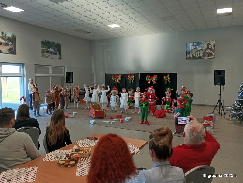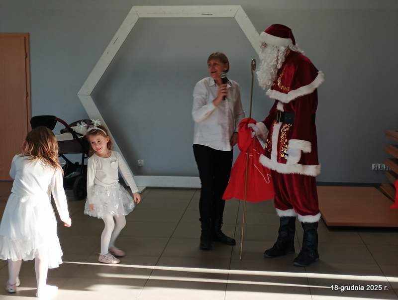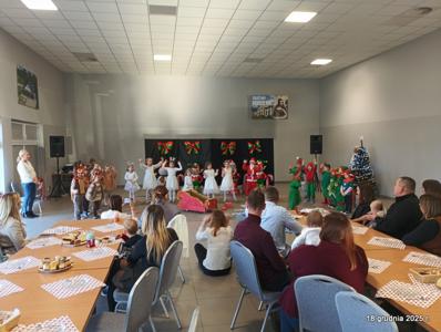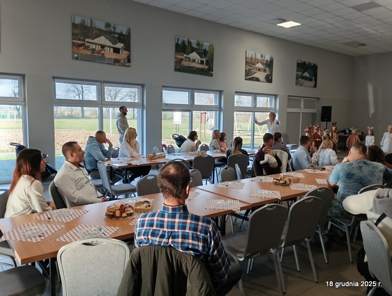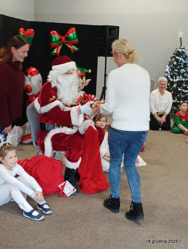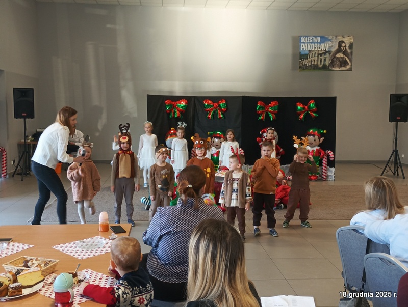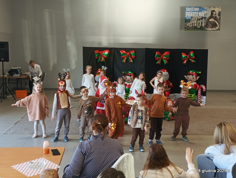 18 grudnia 2025r. w naszym przedszkolu odbyło się świąteczne spotkanie przy choince z udziałem dzieci i rodziców. Przedszkolaki zaprezentowały występy artystyczne pt. "Mikołajowe prezenty" i po raz pierwszy zagrały na dzwoneczkach. Dzieci z powodzeniem pokonały tremę i z wielkim zaangażowaniem zaprezentowały się na scenie, zachwycając widzów pięknym występem. W trakcie spotkania dzieci odwiedził Gwiazdor i otrzymały prezenty. Następnie wszyscy uczestnicy zostali zaproszeni na poczęstunek.