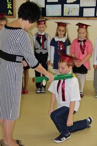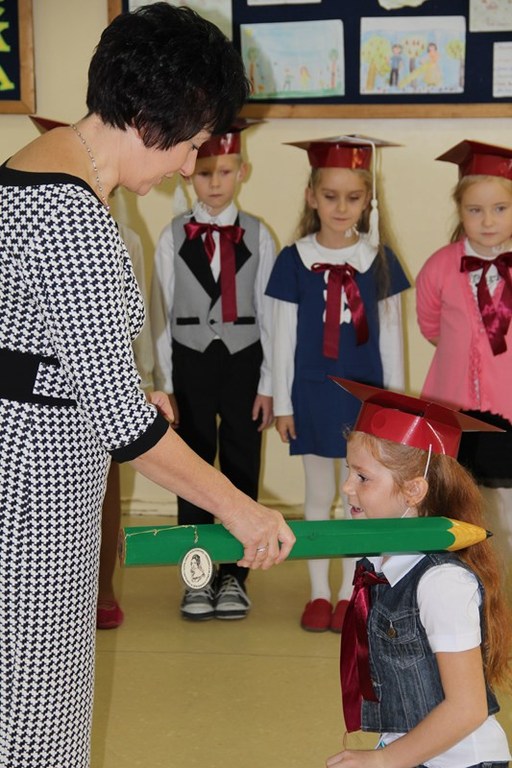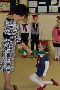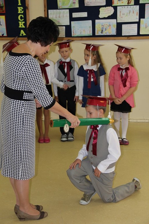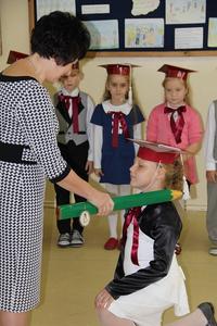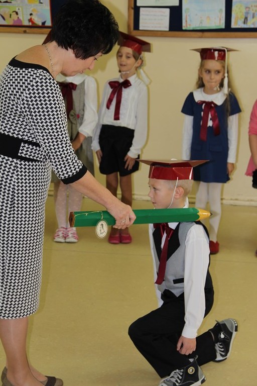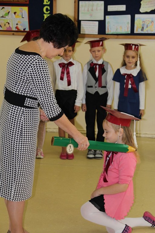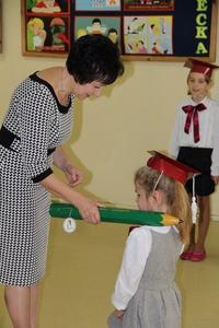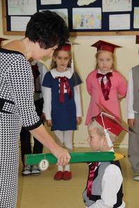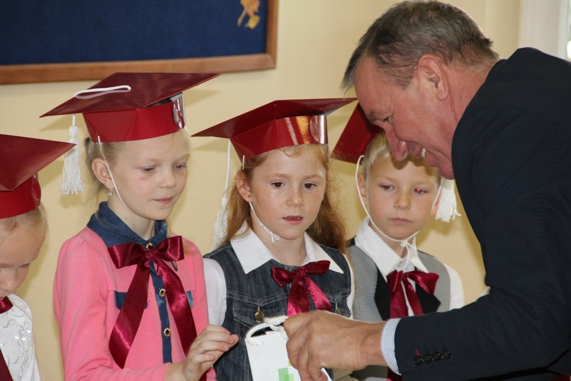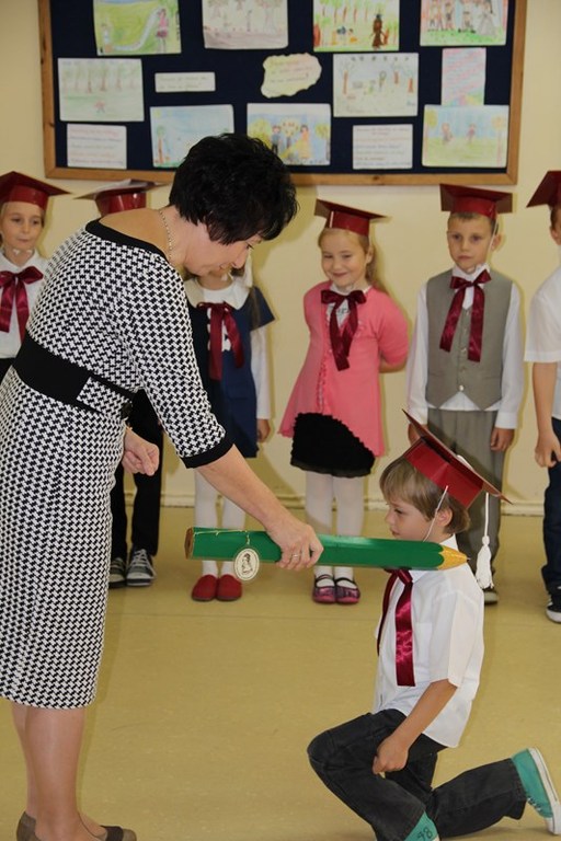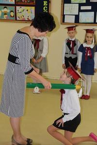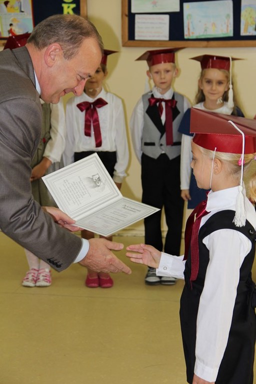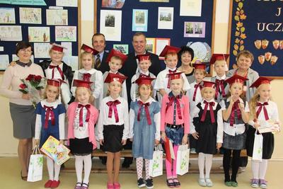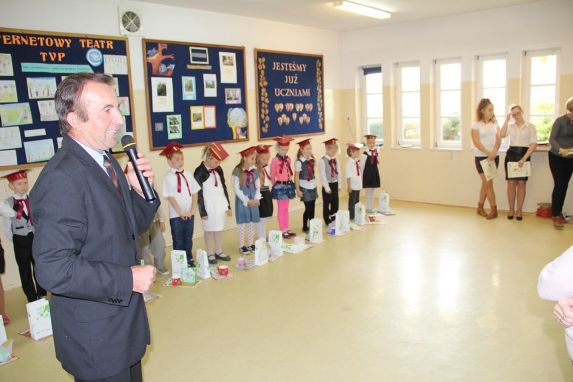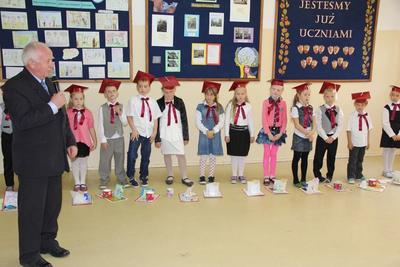 Następnie starsi koledzy wręczyli pierwszoklasistom własnoręcznie wykonane upominki, a zaproszeni goście słodycze.Tradycją uroczystości stało się wręczenie uczniom książeczek SKO z wkładem pieniężnym ufundowanym przez Radę Rodziców.W tym roku książeczki wręczył prezes Banku Spółdzielczego pan Mirosław Bąk.