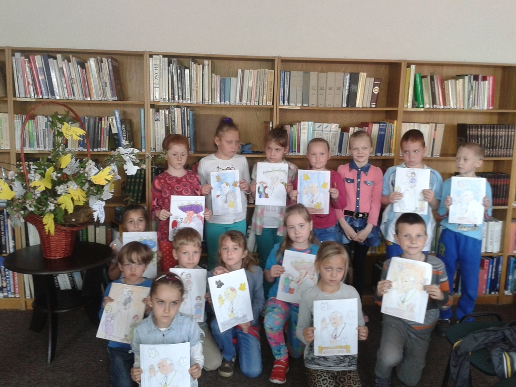 Na kilka dni przed kanonizacją Jana Pawła II w Bibliotece Publicznej Miasta i Gminy Lwówek odbyła się lekcja biblioteczna, w której uczestniczyli uczniowie klas I-III naszej szkoły. Dzieci mogły obejrzeć film opowiadający o dzieciństwie Karola Wojtyły, jego drodze do kapłaństwa i papiestwa. Potem był też czas na pracę w grupach. Najpierw dzieci zapoznały się z pięknie ilustrowanymi, dostosowanymi do potrzeb najmłodszego odbiorcy książkami, mówiącymi o świętym już Janie Pawle II. Następnie kolorowały portrety papieża, stworzyły drzewko dobrych myśli dla papieża, a także symbolicznie wysłały do nieba gołębice ze słowami, które chciałyby powiedzieć Karolowi Wojtyle. Wszystkie wykonane przez uczniów prace wzbogaciły wystrój lwóweckiej biblioteki.